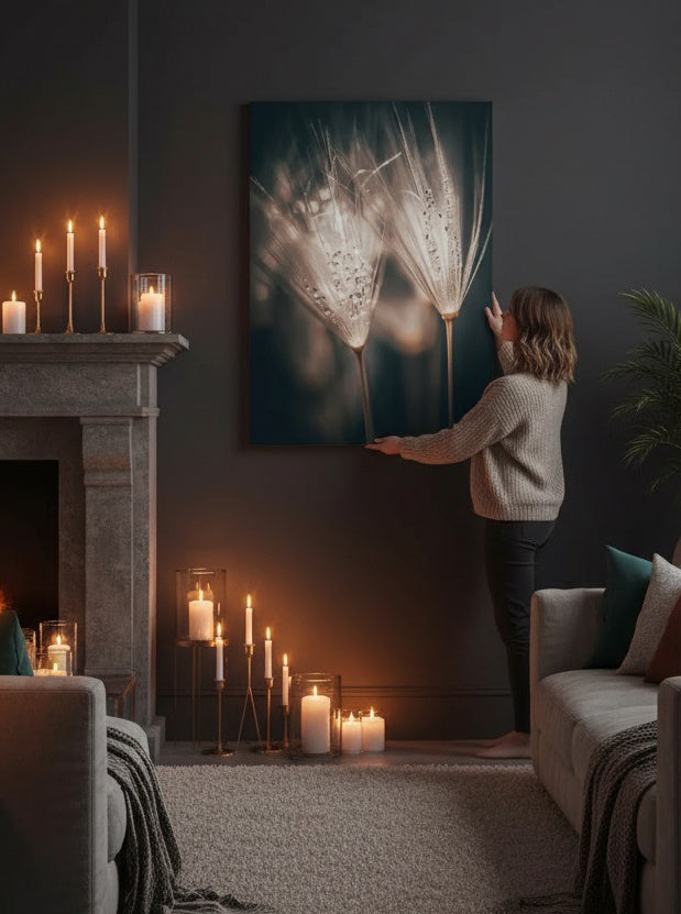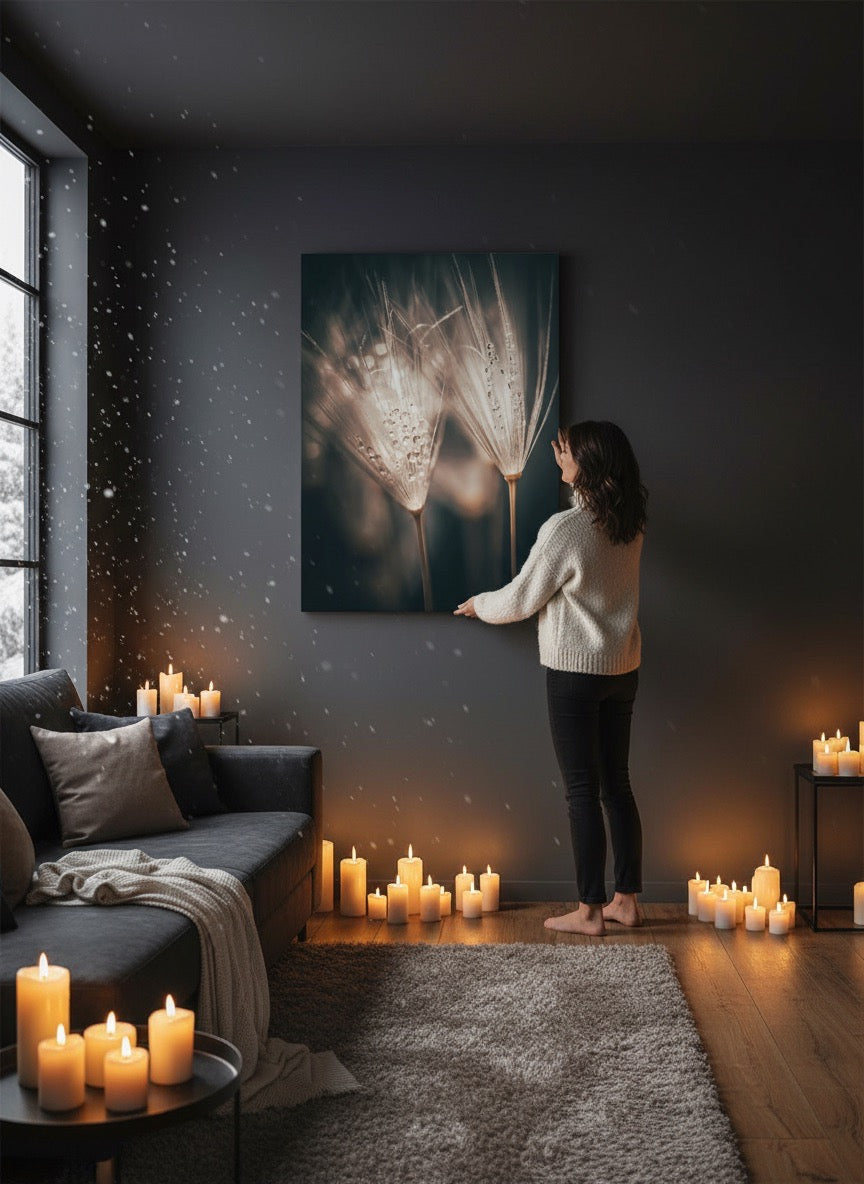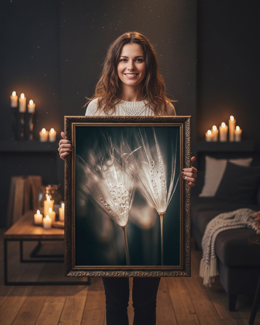 Spennende kunstbilde av to løvetannfrø med regndråper. Blir du ikke i god stemning vel, når du ser dette bildet? Få et vakkert og unikt kunstverk på veggen med dette bildet. Passer nydelig til moderne beige toner og vil løfte ditt interiør.