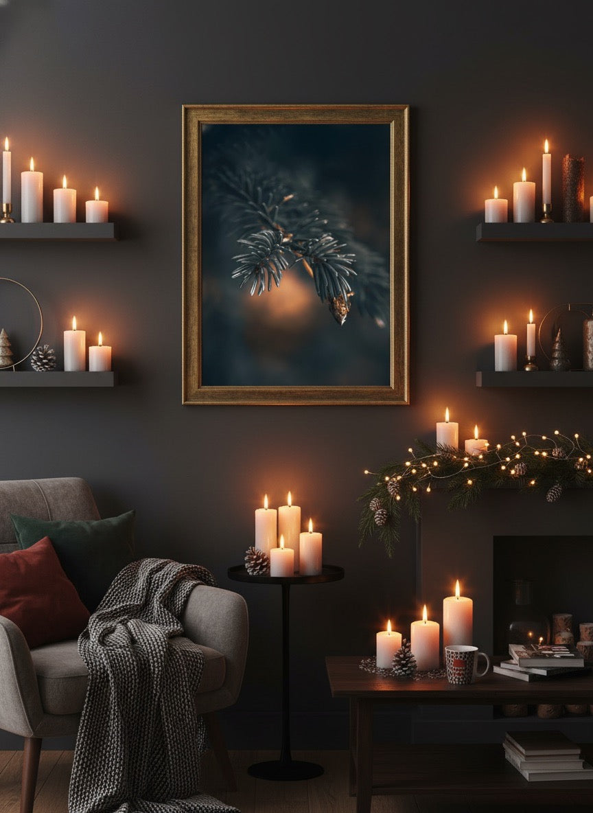 Nydelig og varmt fotografisk kunstbilde av en granbar gren i nydelige toner av blågrå med varmt gyldent lys i bakgrunnen. Få et varmende og stemningsskapende bilde på veggen du også.