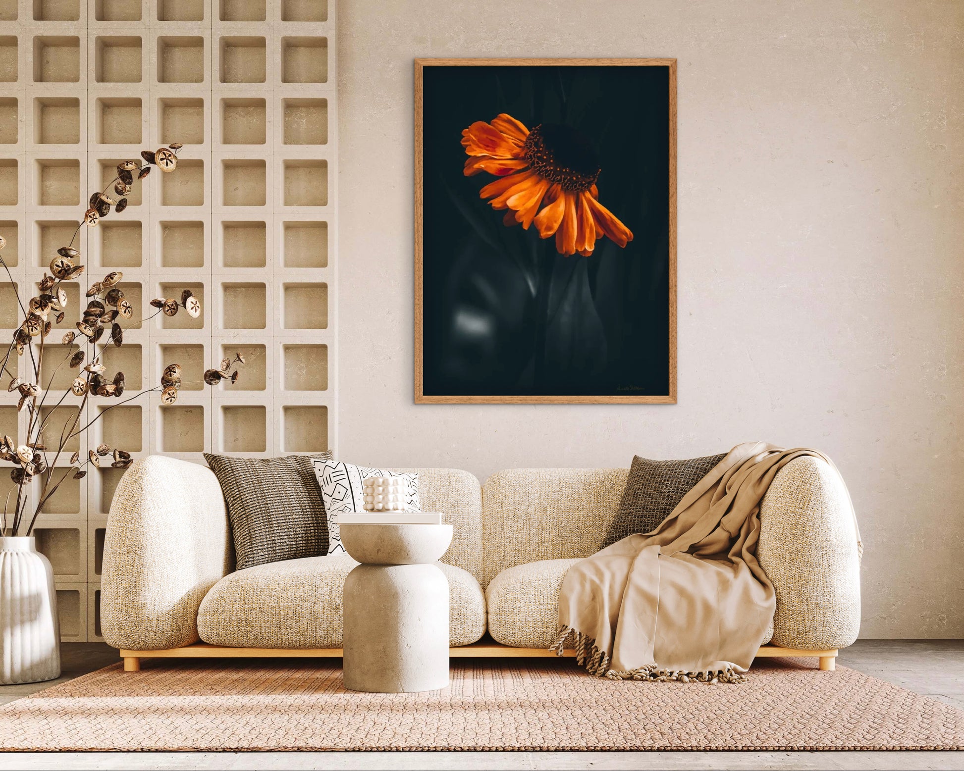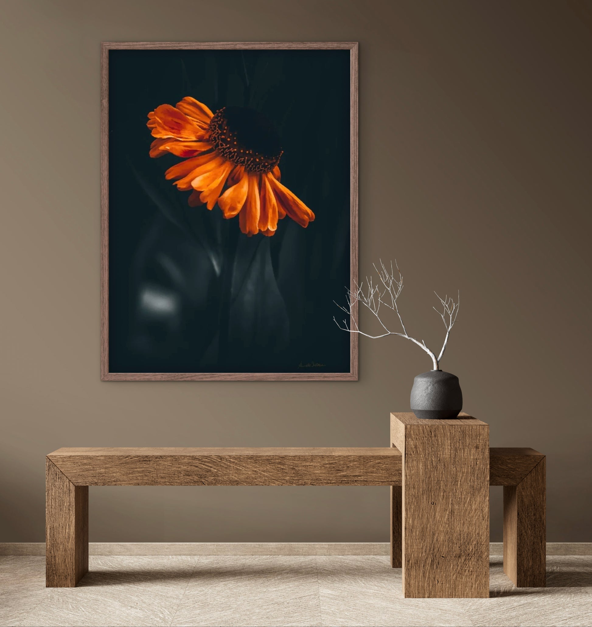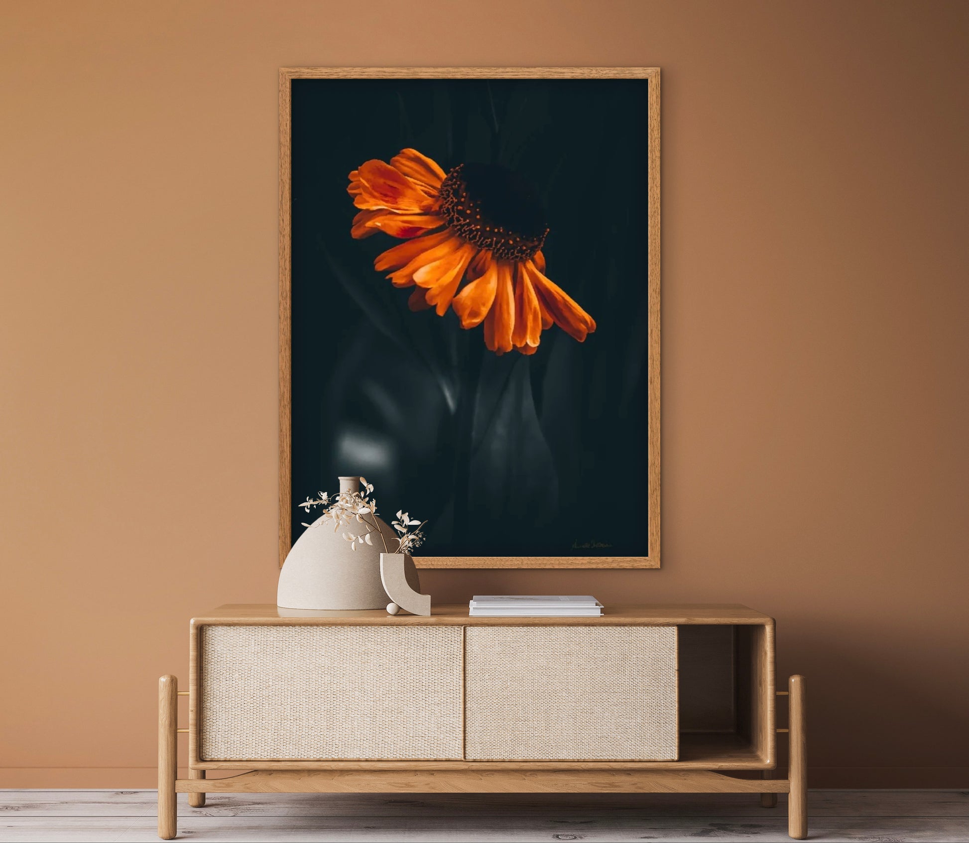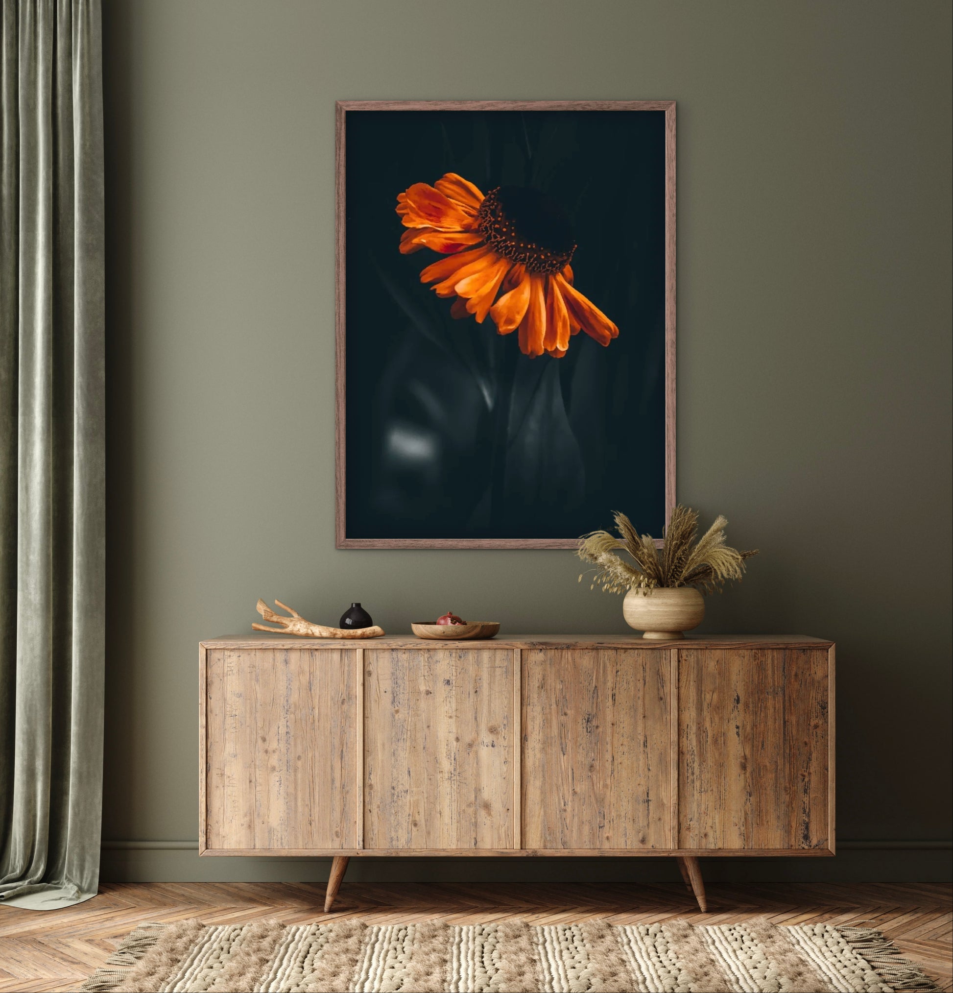 Nydelig veggbilde i vakre fargetoner av en høstsolbrud blomst. Blomsten er i en nydelig oransje farge mot en gråblå bakgrunn. Få et kunstverk på veggen som gir deg energi, men også ro i sjelen.