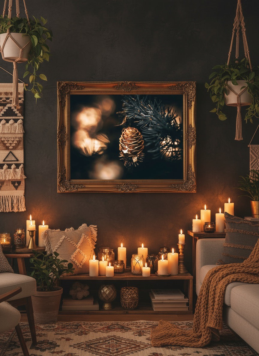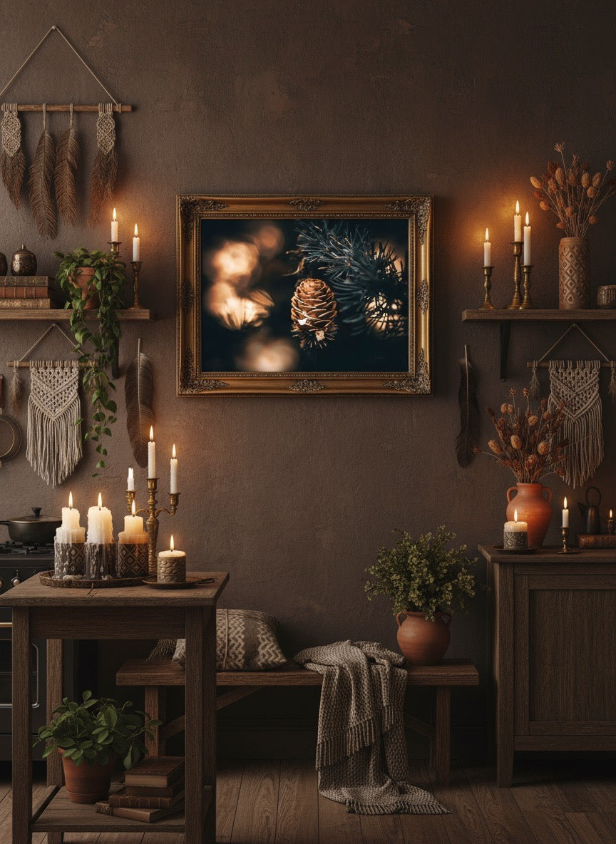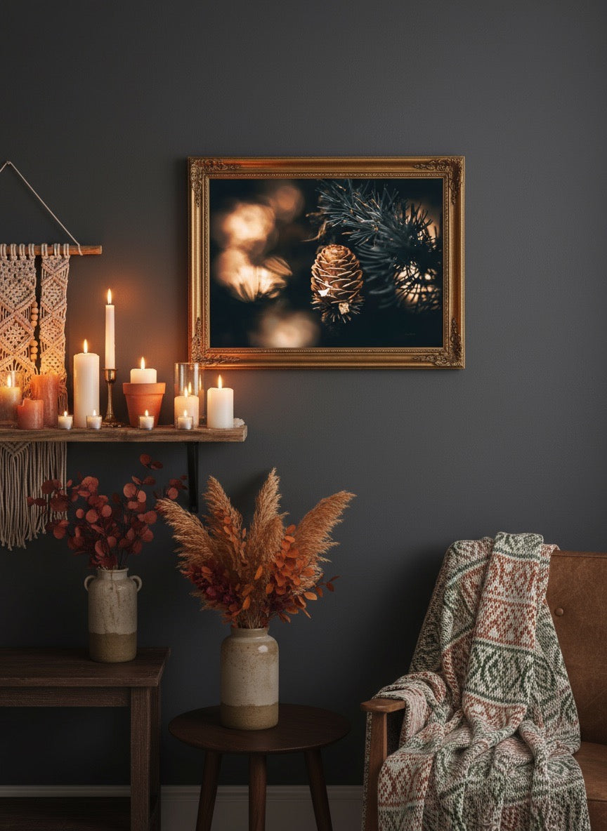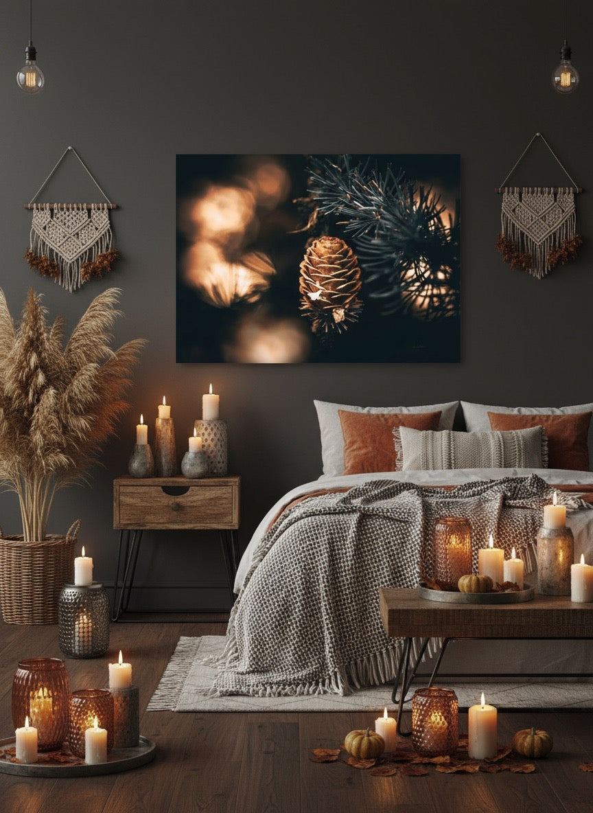 Nydelig og varmt fotografisk kunstbilde av en lerkekongle i nydelige varme toner, med spennede bakgrunn. Få et varmende og stemningsskapende bilde på veggen i dag du også.