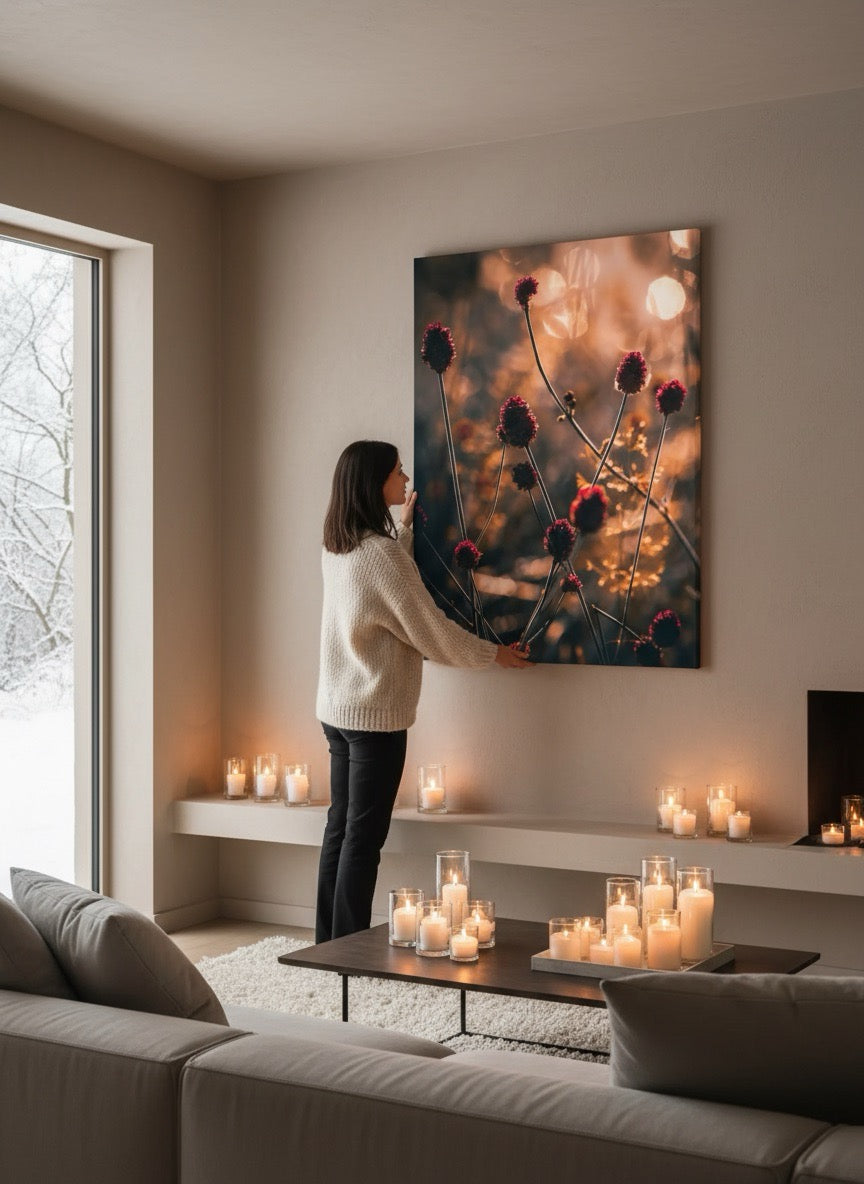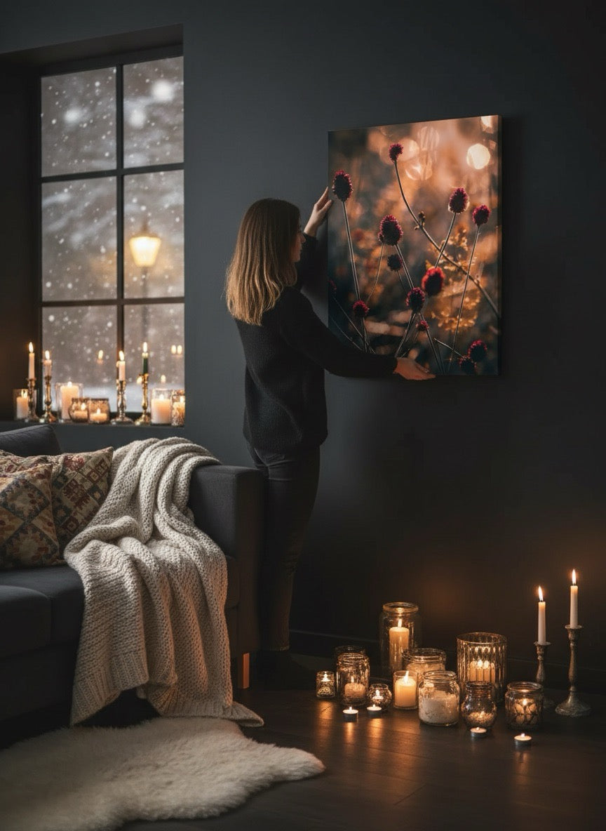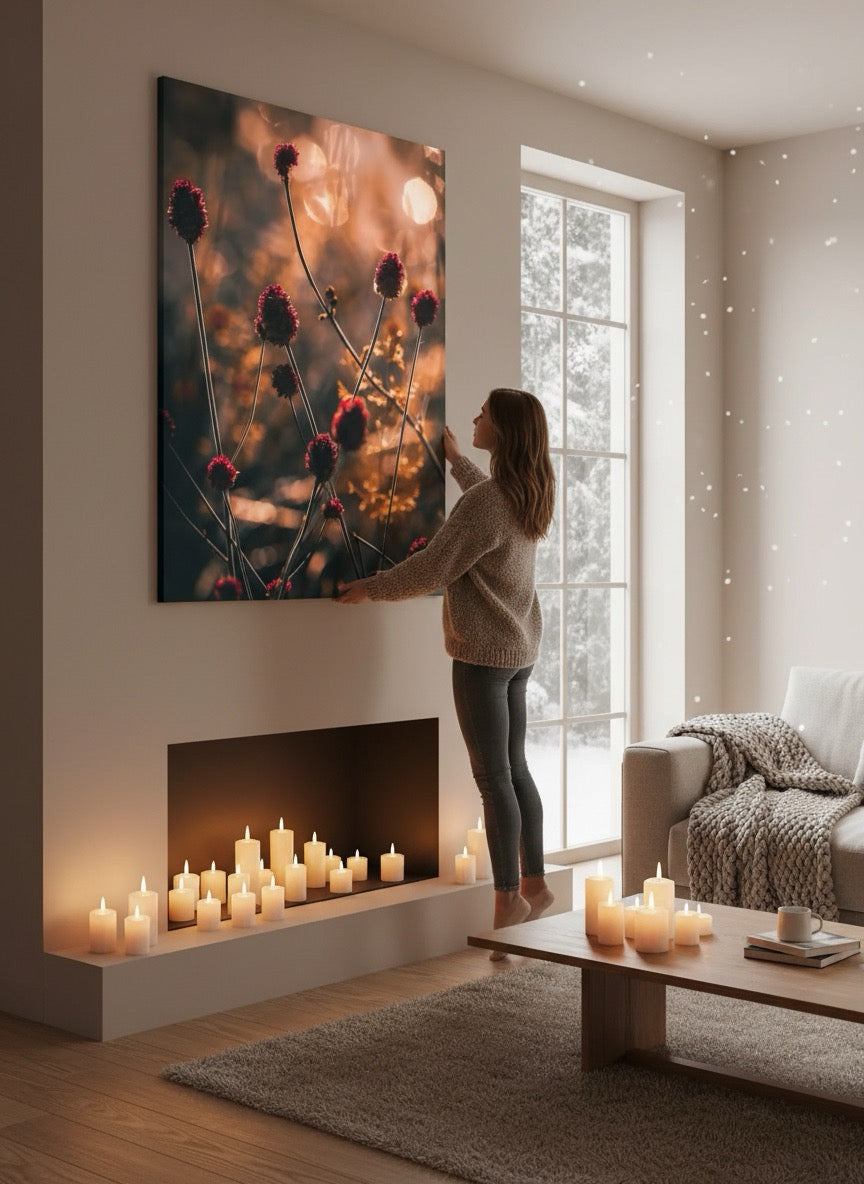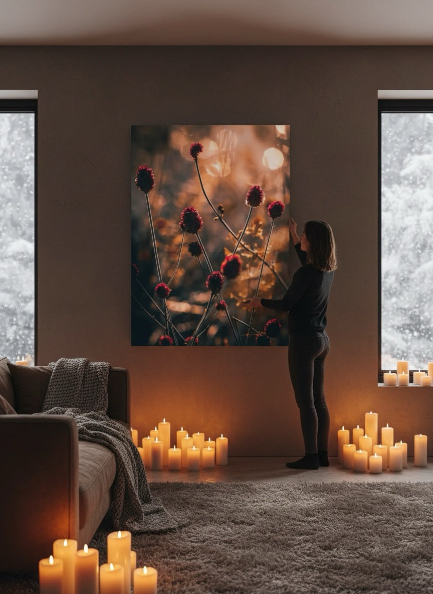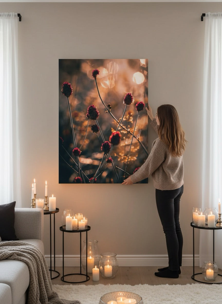 Nydelig kunstbilde av små røde strå i vakkert, gyldent lys. Få et skikkelig stemningsfullt bilde på veggen med dette vakre motivet.