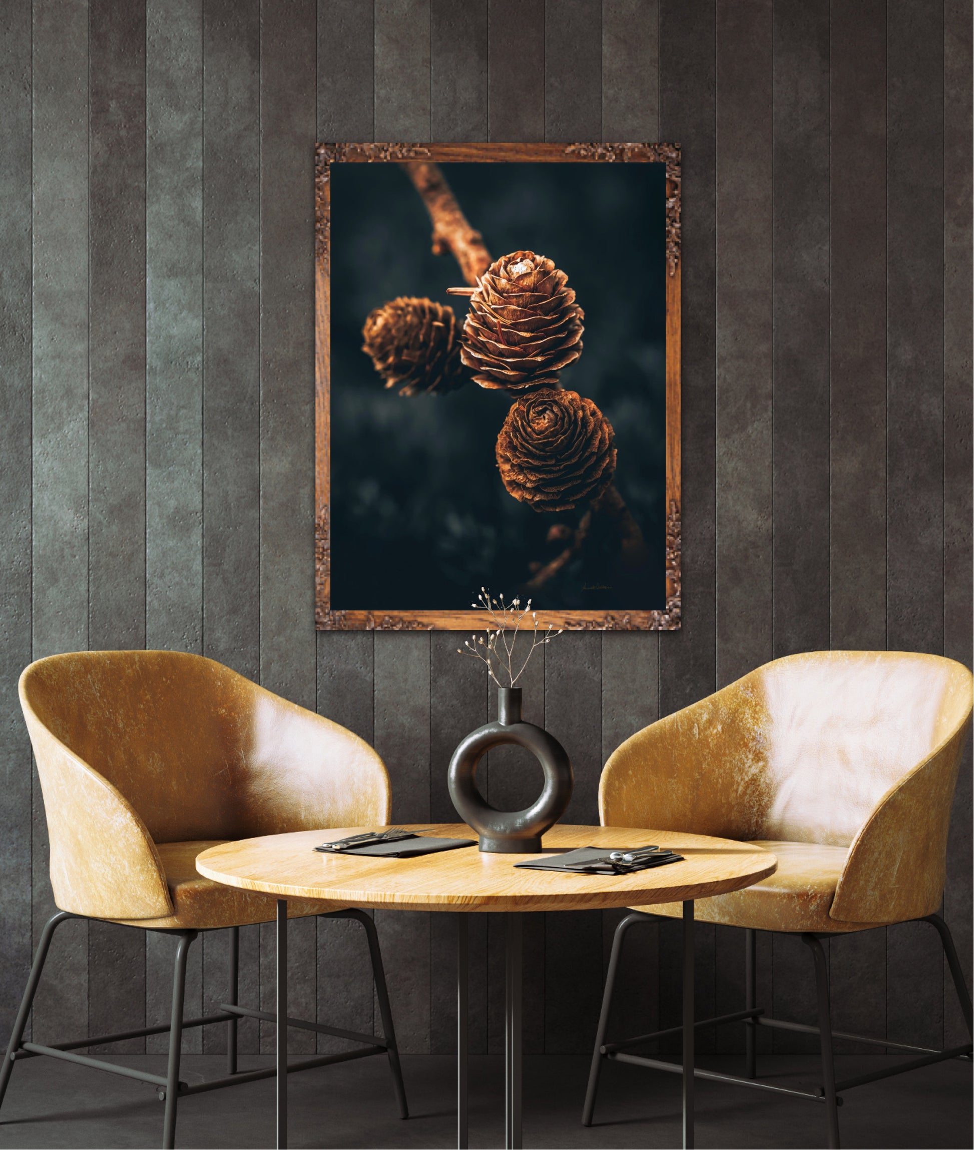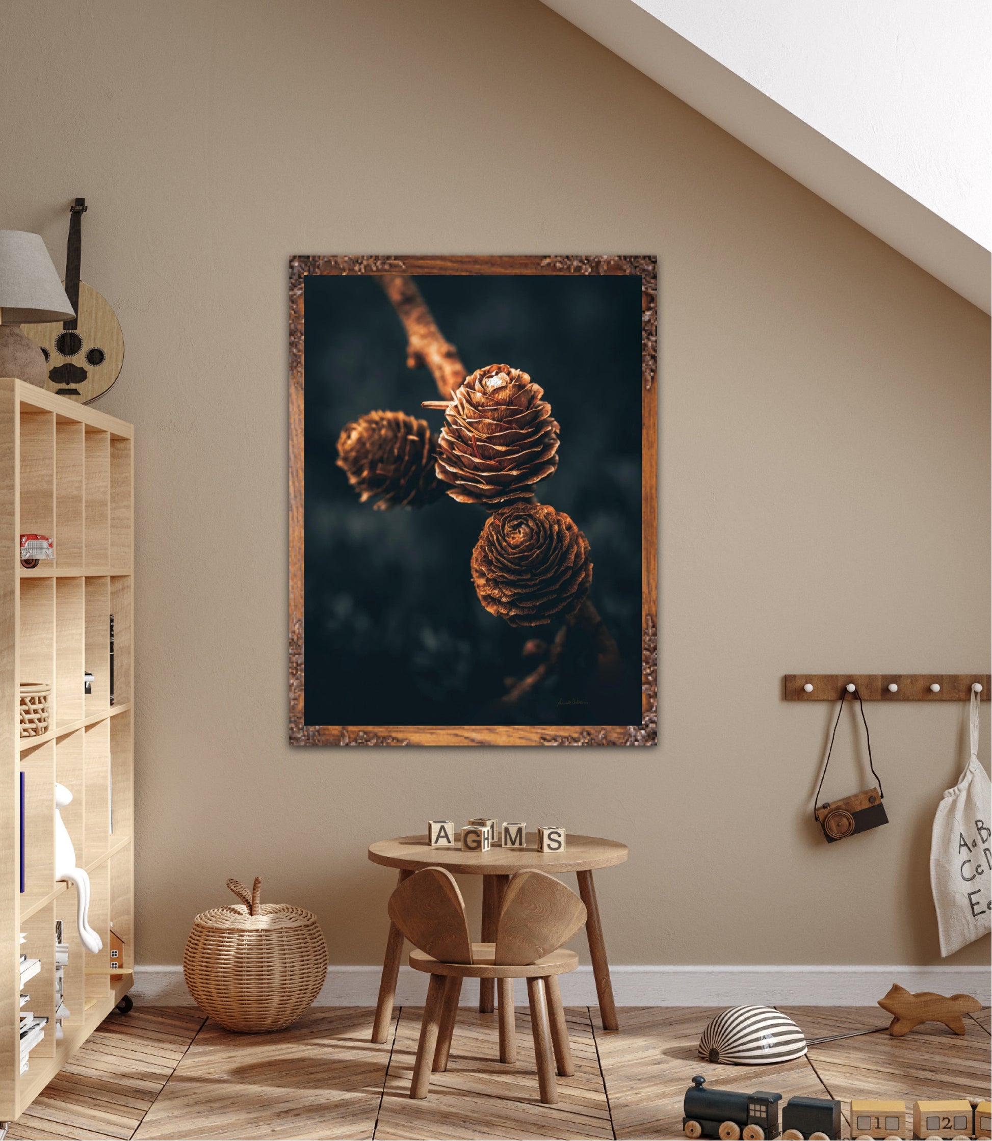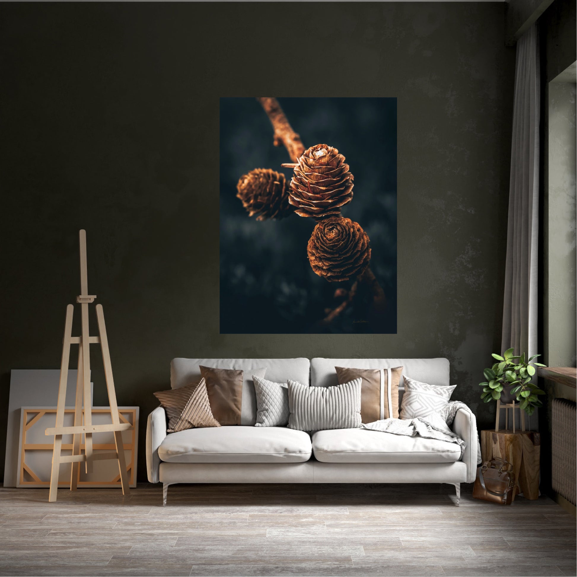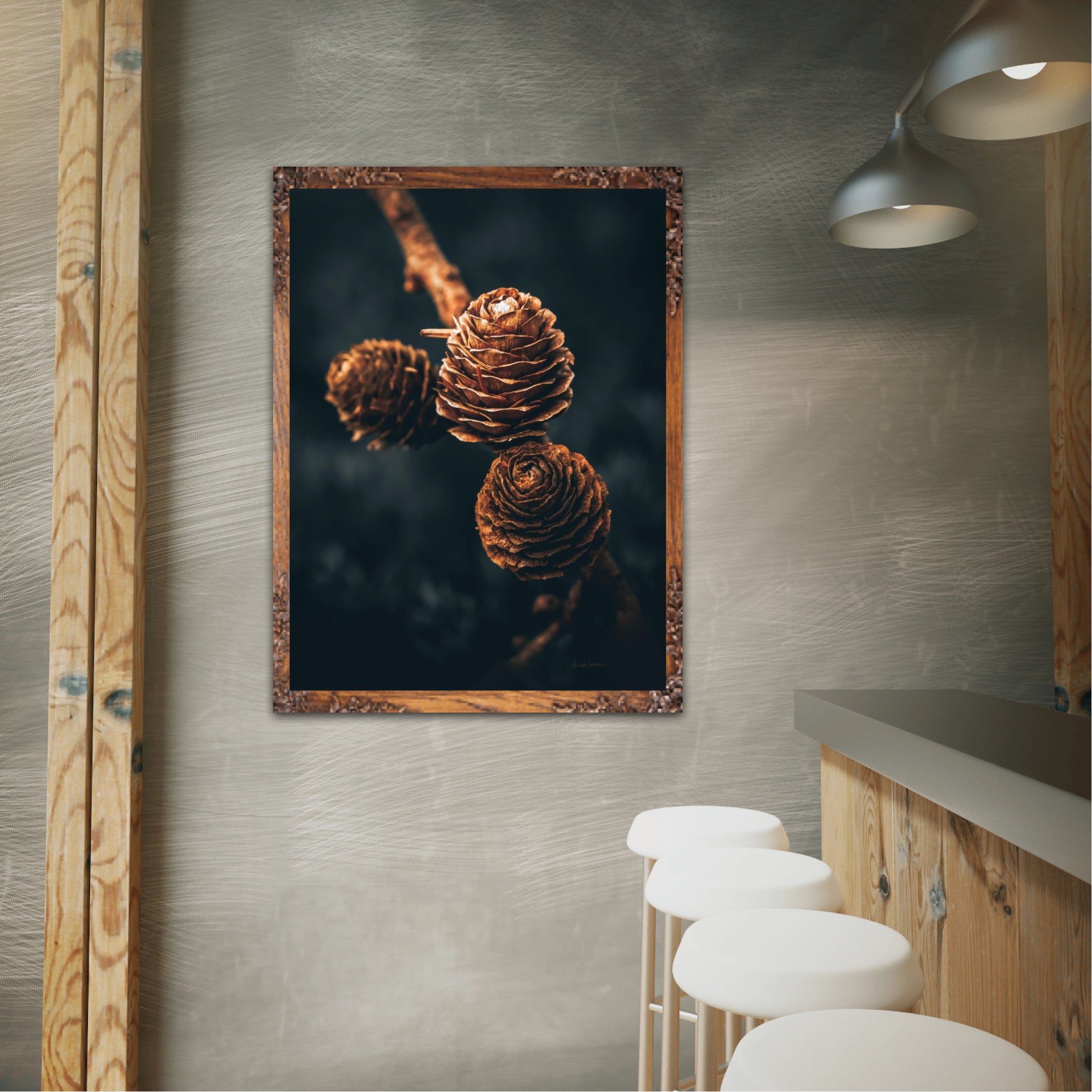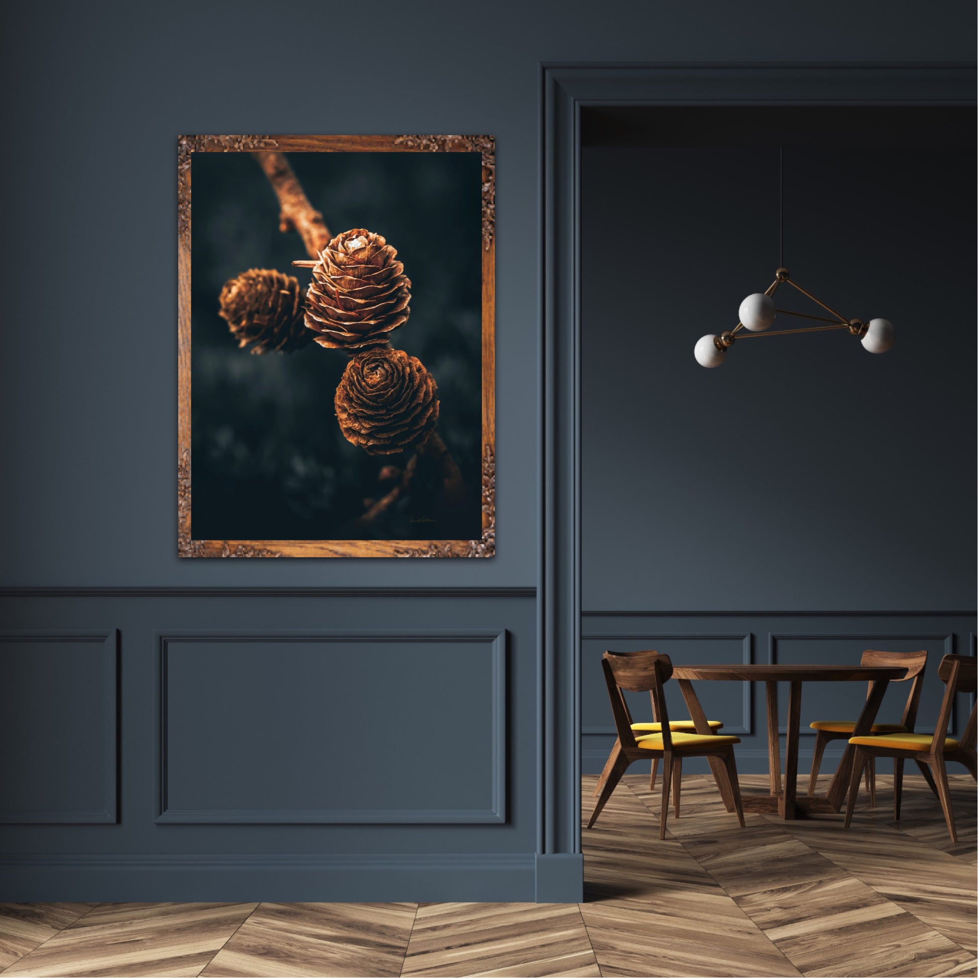 Nydelig kunstbilde av tre lerkekongler på en gren i vakre gyldne brune toner mot en gråblå bakgrunn. Nydelig kongler som gjør seg flott på veggen hos deg!
