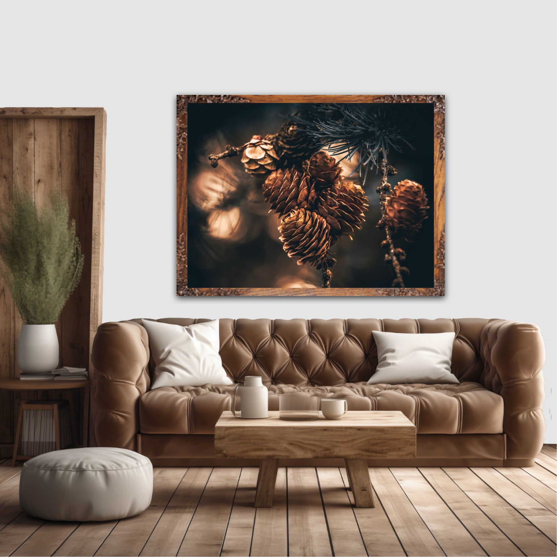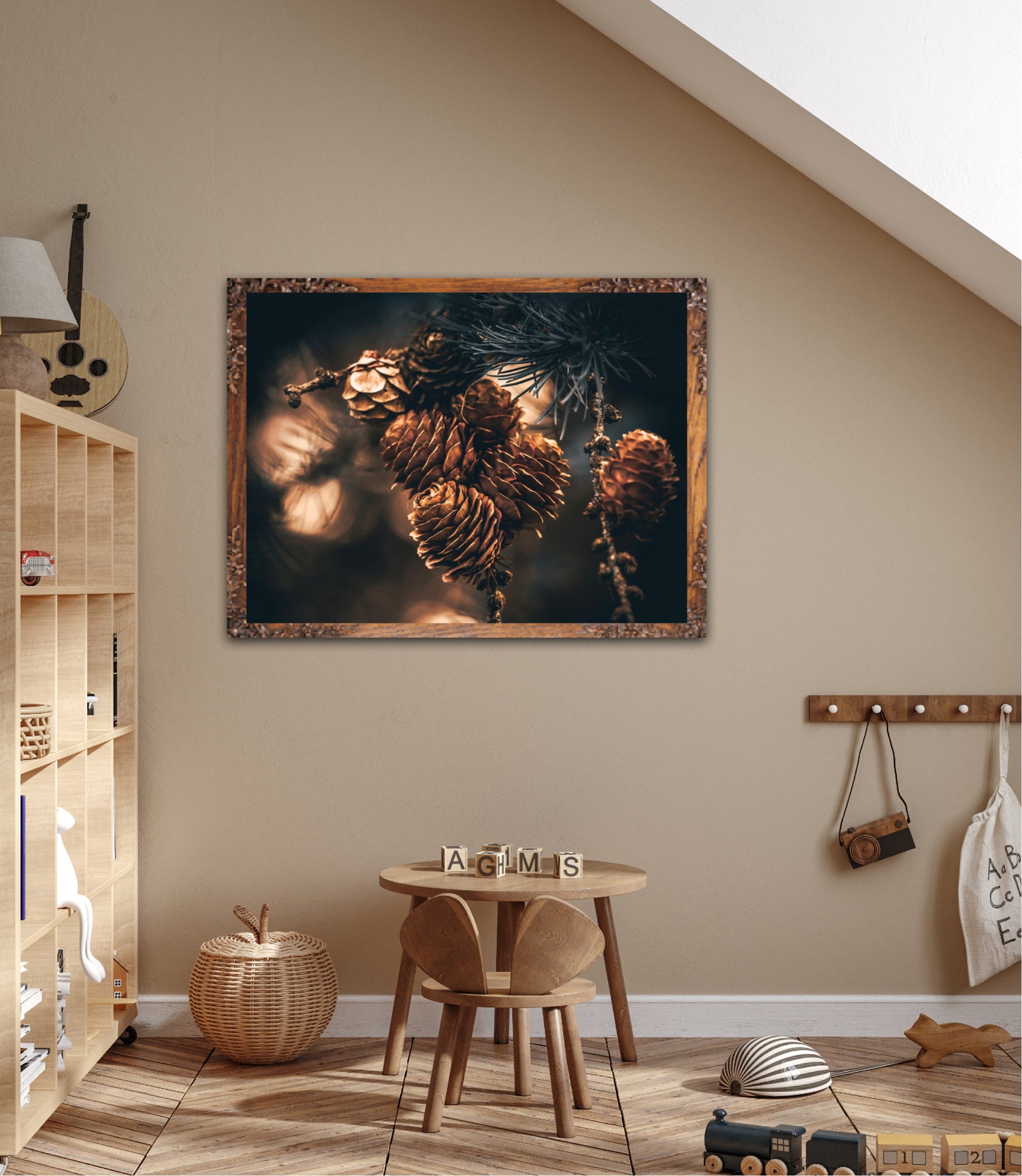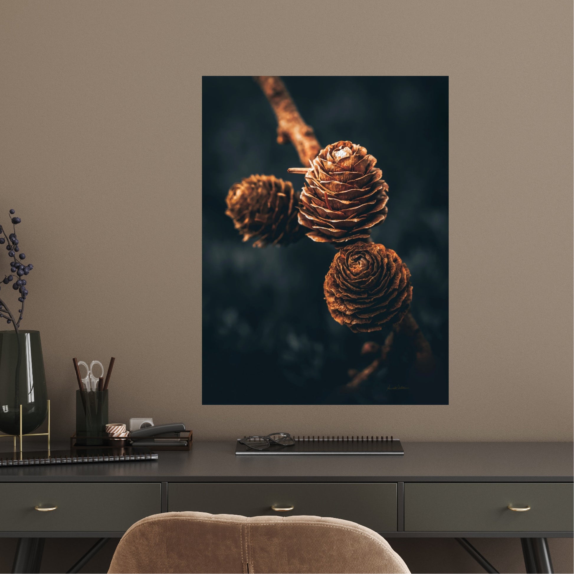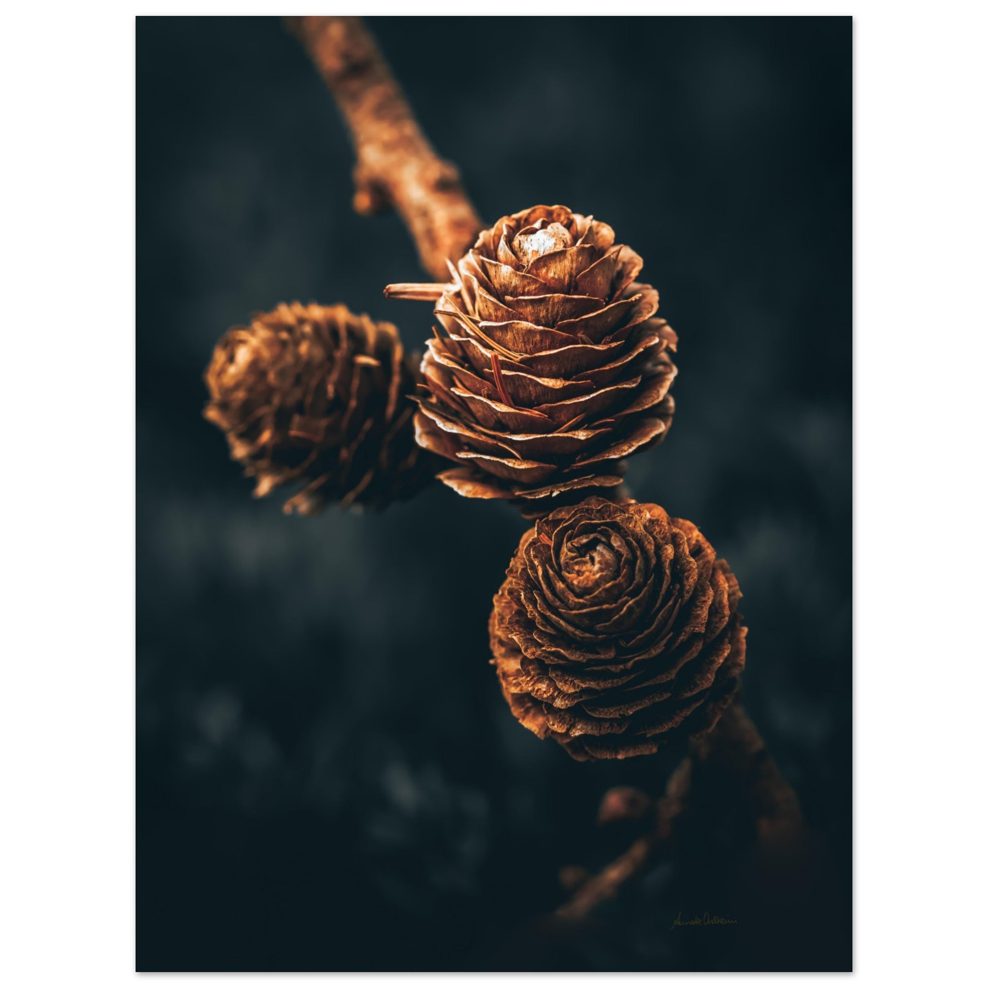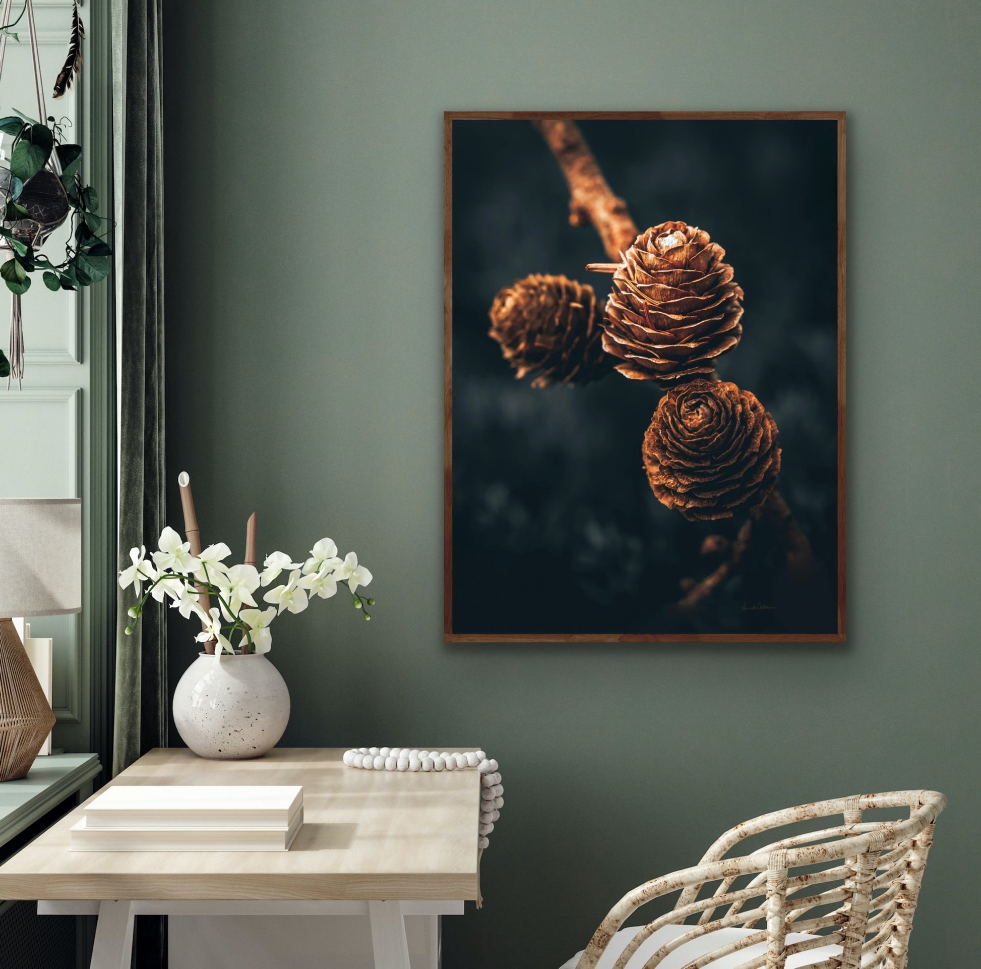 Nydelig kunstbilde av tre lerkekongler på en gren i vakre gyldne brune toner mot en gråblå bakgrunn. Nydelig kongler som gjør seg flott på veggen hos deg!