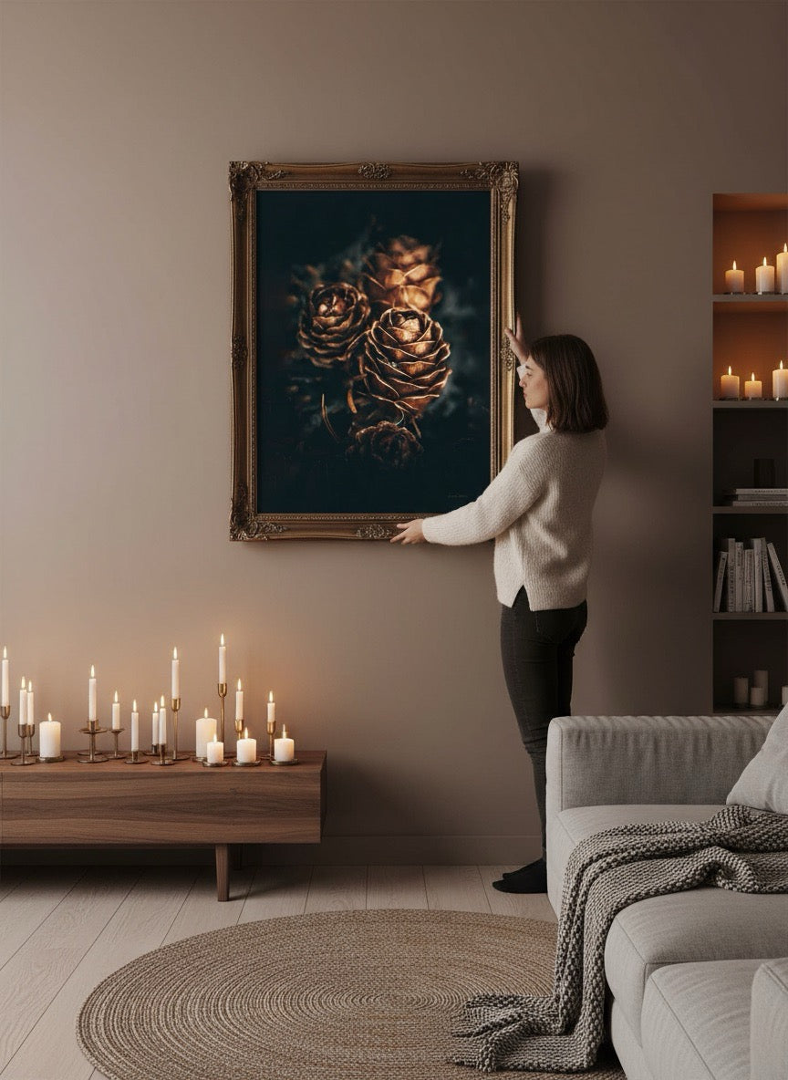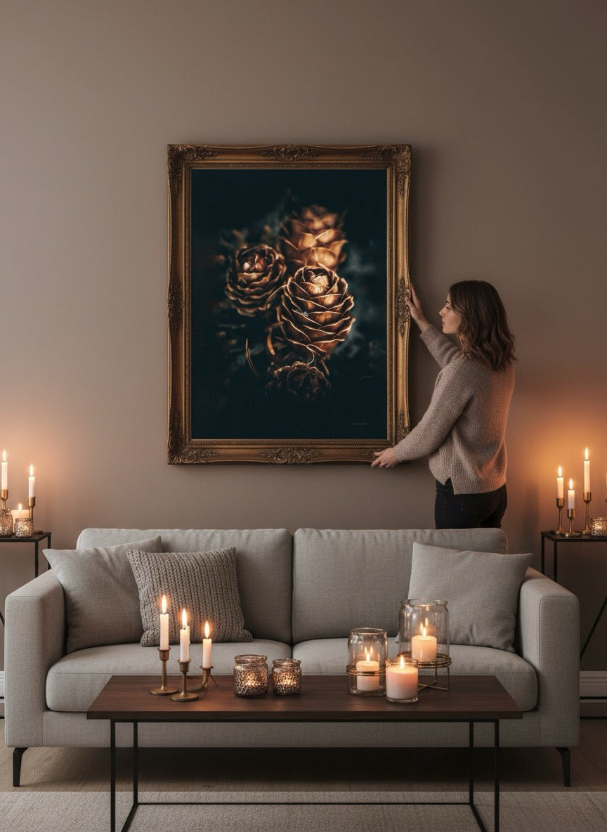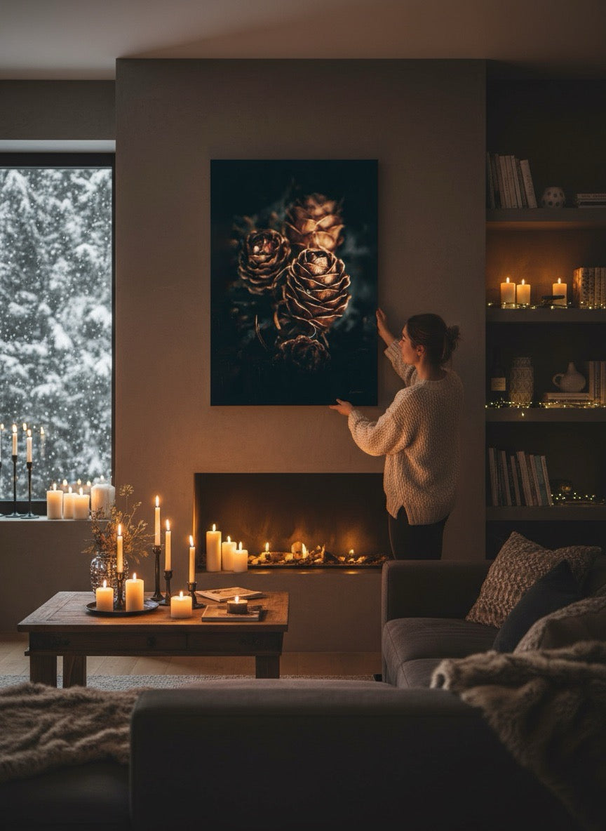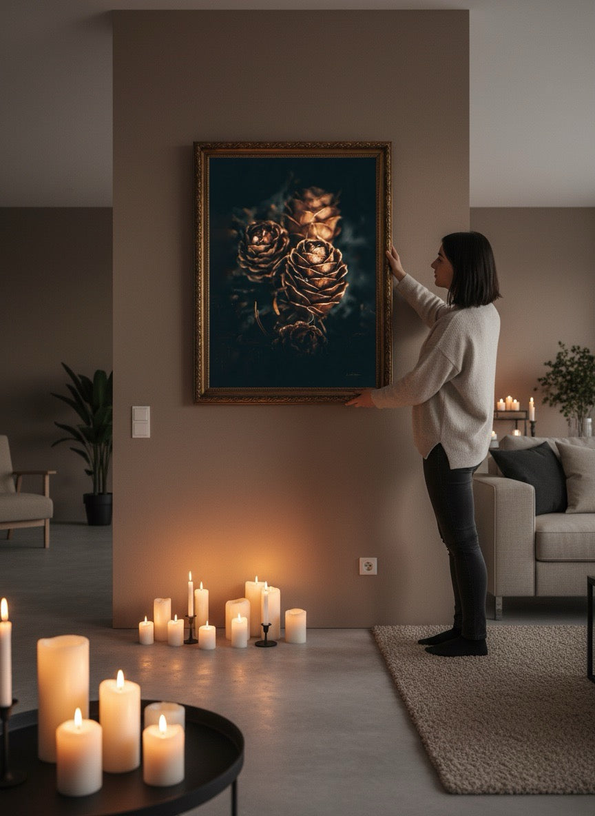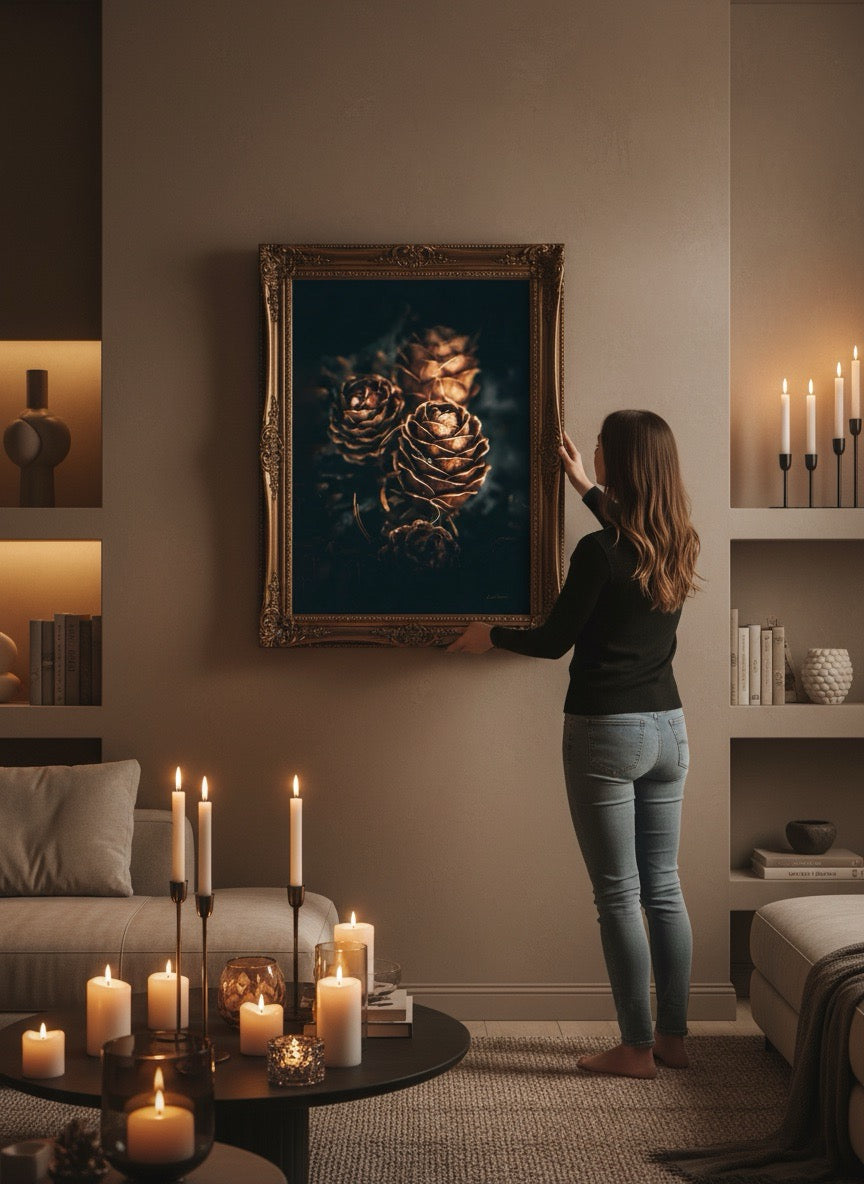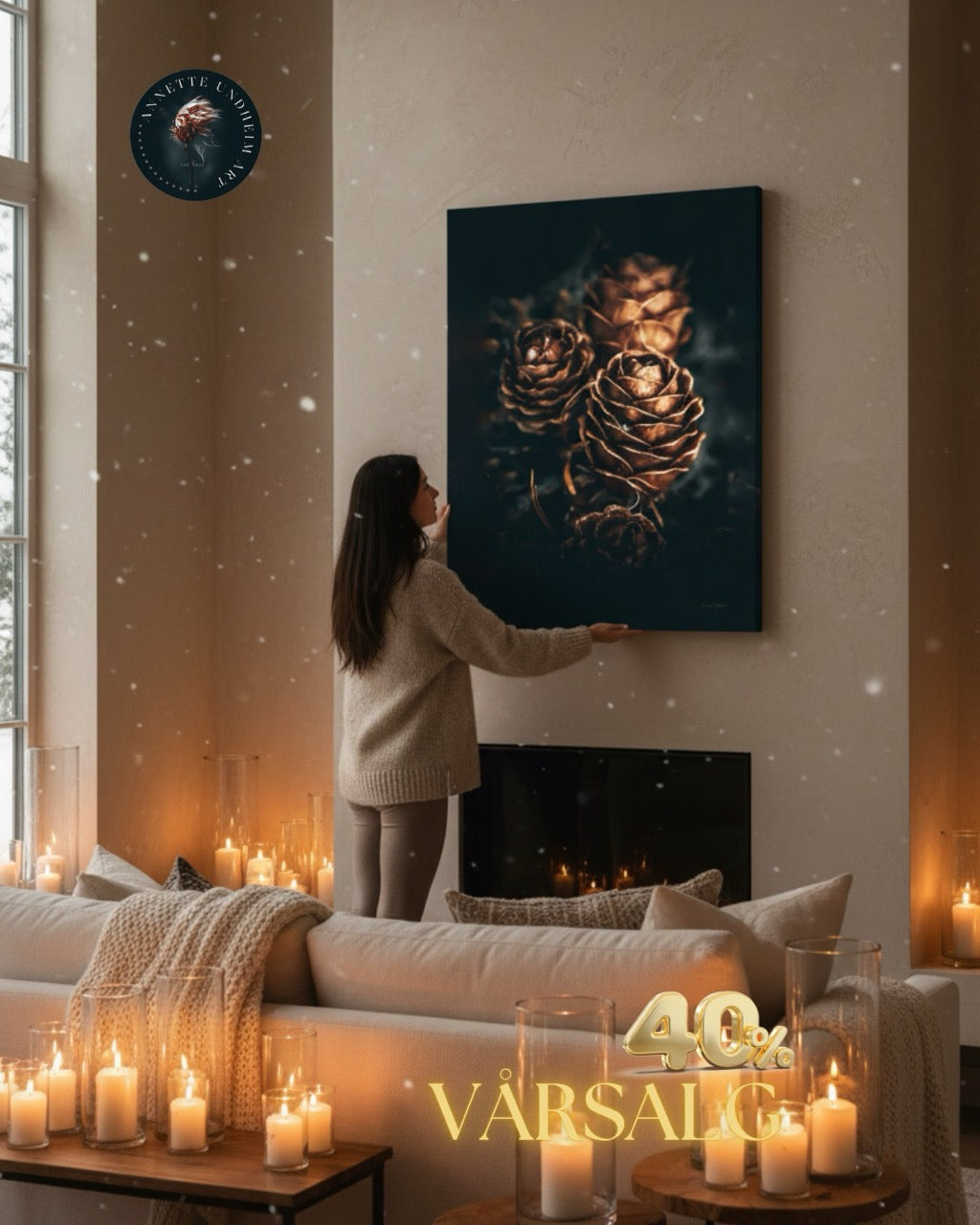 Nydelig kunstbilde av tre kongler som skinner så fint i gyldent lys. Fargene er vakre jordtoner og er veldig behagelige å se på. Dette veggbildet vil bli et flott smykke på veggen din. Det gir deg ro fra naturen, og vil imponere venner og familie. Få et nydelig kunstverk på veggen. Veggbildet passer spesielt godt på hytta.