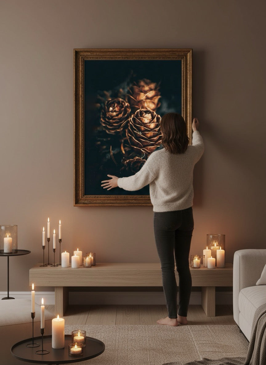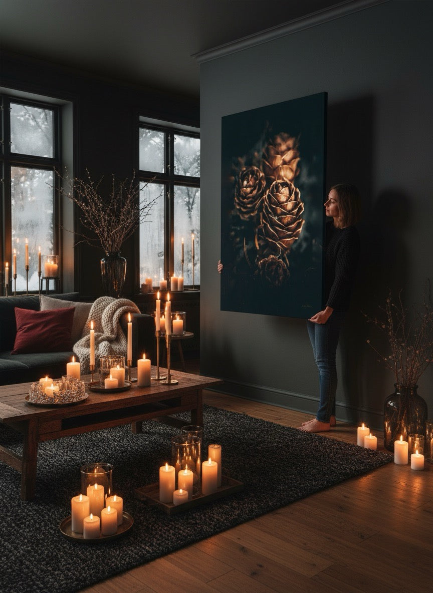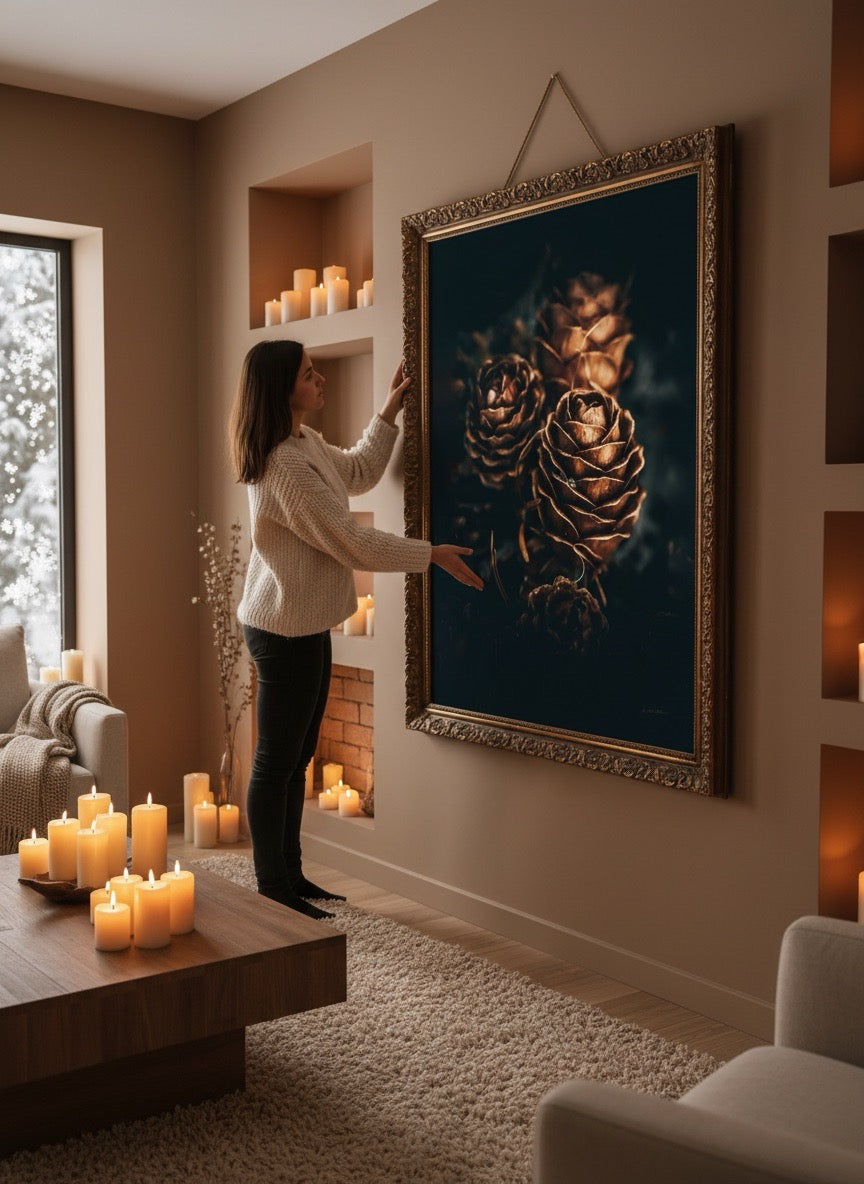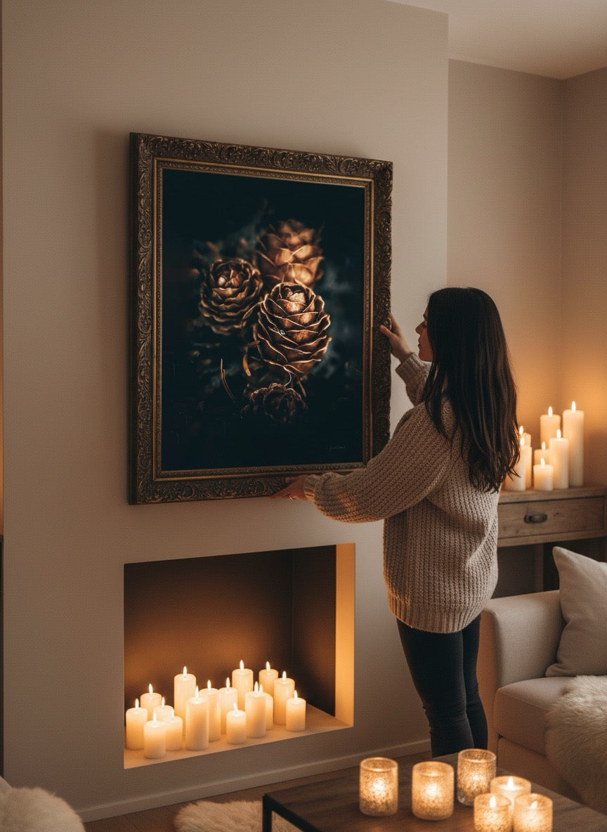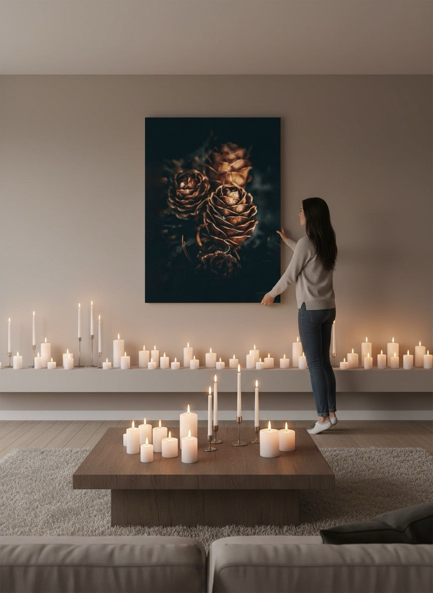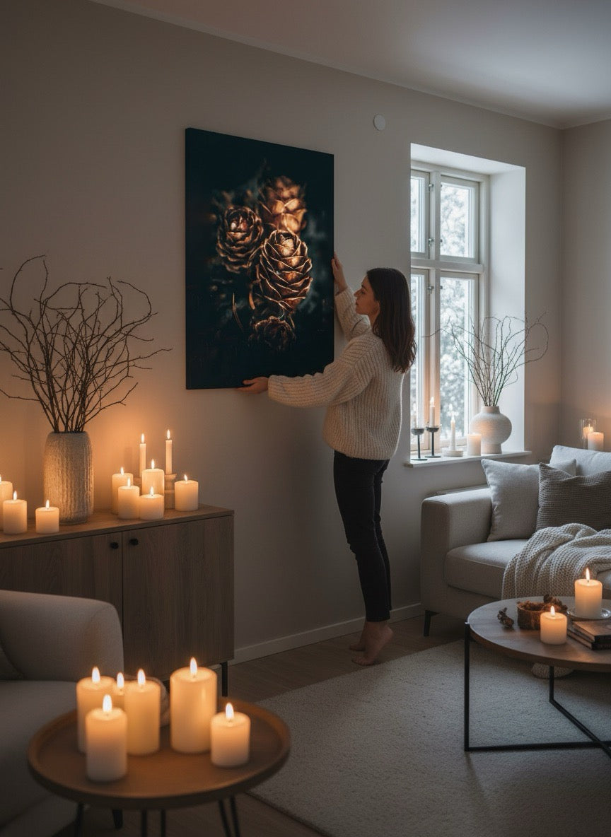 Nydelig kunstbilde av tre kongler som skinner så fint i gyldent lys. Fargene er vakre jordtoner og er veldig behagelige å se på. Dette veggbildet vil bli et flott smykke på veggen din. Det gir deg ro fra naturen, og vil imponere venner og familie. Få et nydelig kunstverk på veggen. Veggbildet passer spesielt godt på hytta.
