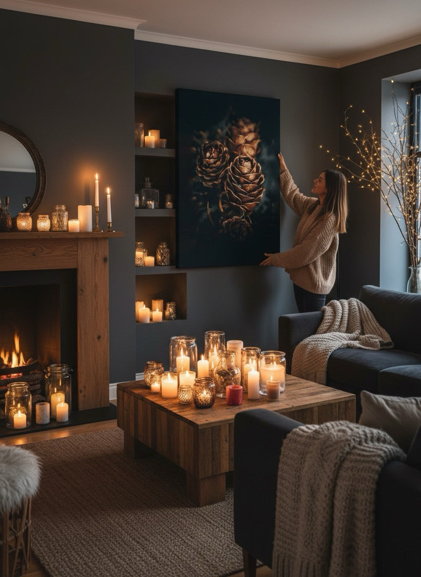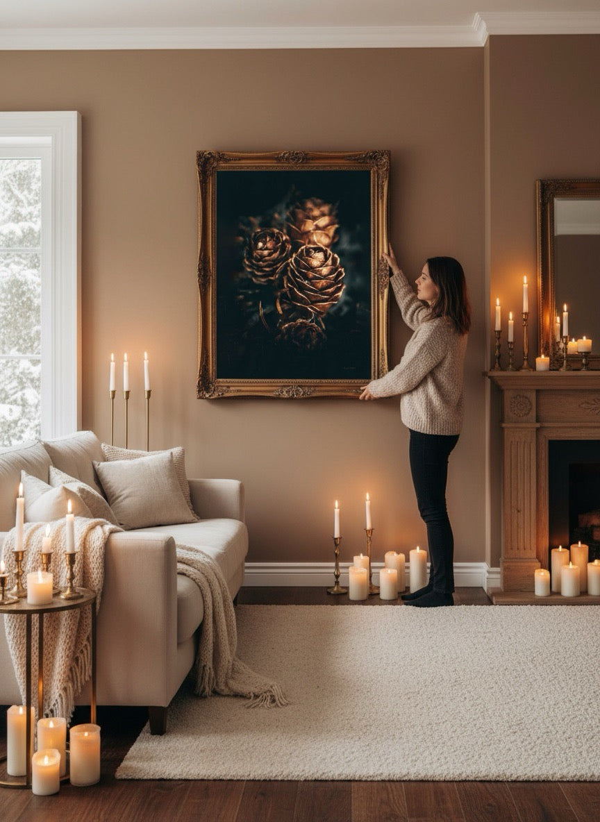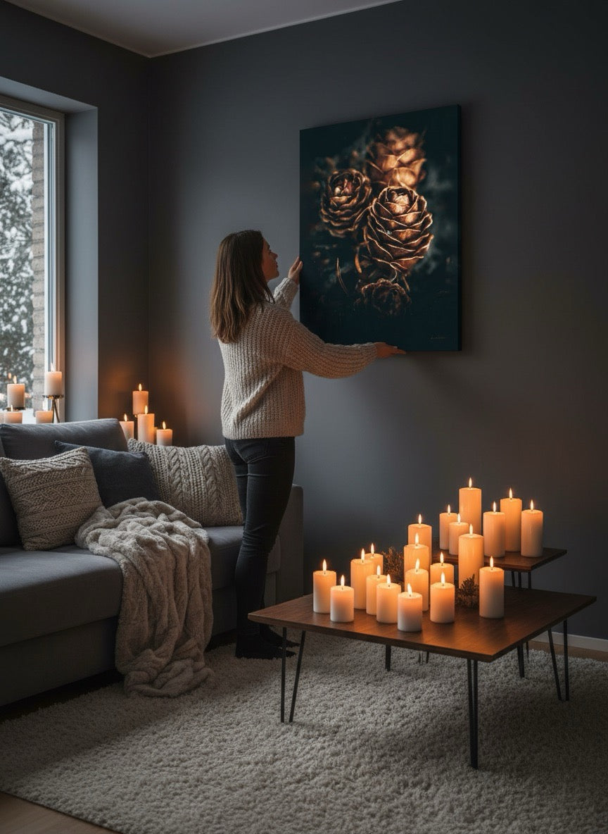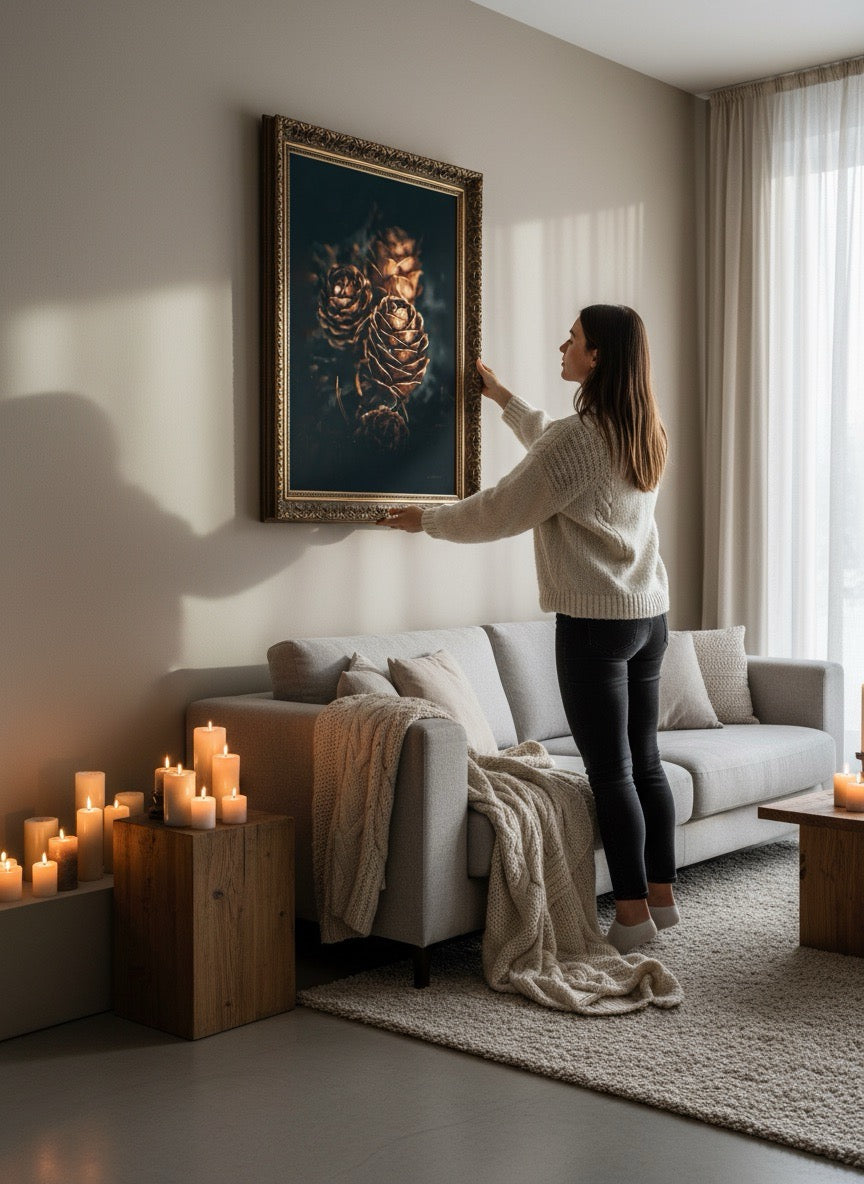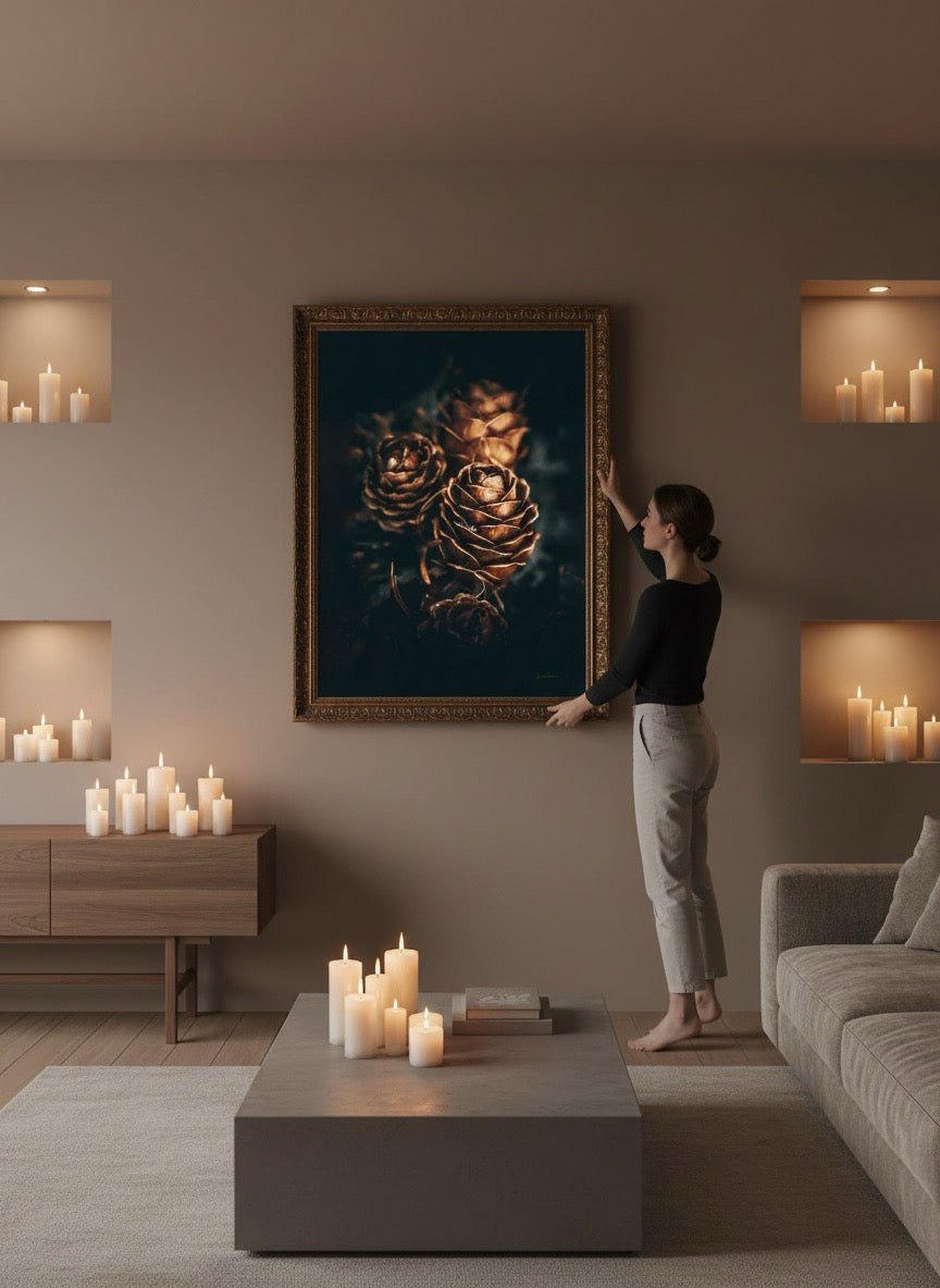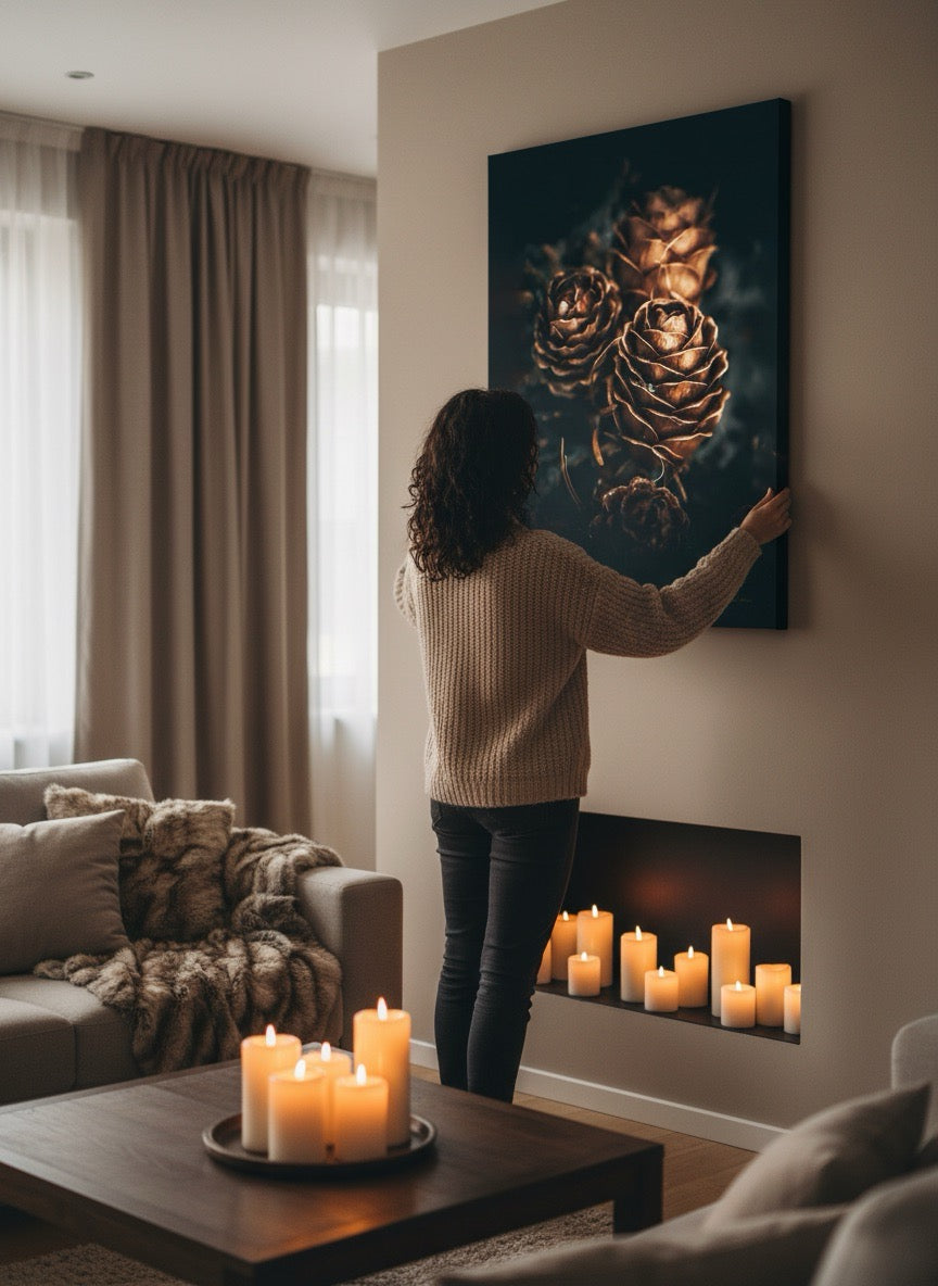 Nydelig kunstbilde av tre kongler som skinner så fint i gyldent lys. Fargene er vakre jordtoner og er veldig behagelige å se på. Dette veggbildet vil bli et flott smykke på veggen din. Det gir deg ro fra naturen, og vil imponere venner og familie. Få et nydelig kunstverk på veggen. Veggbildet passer spesielt godt på hytta.