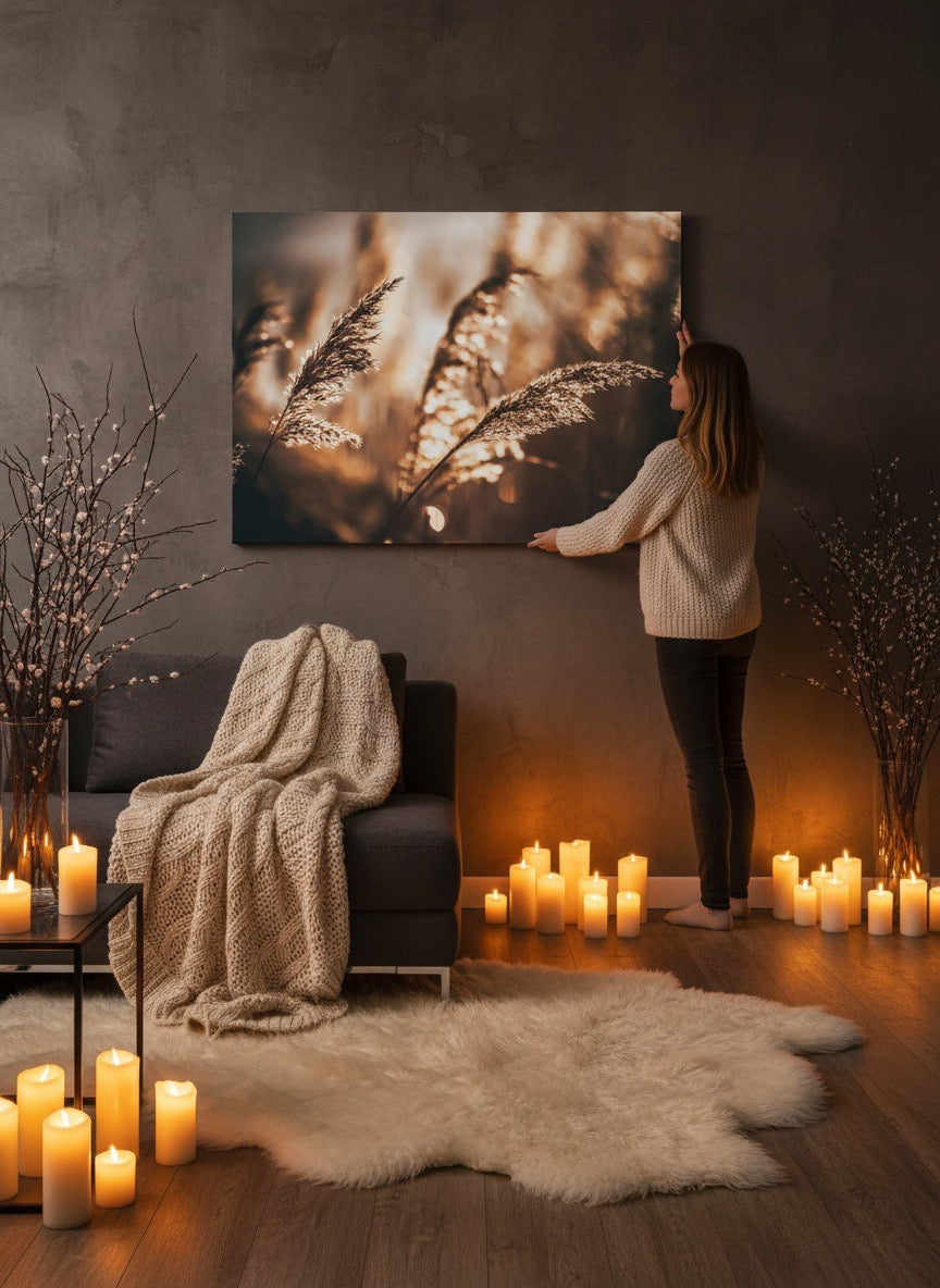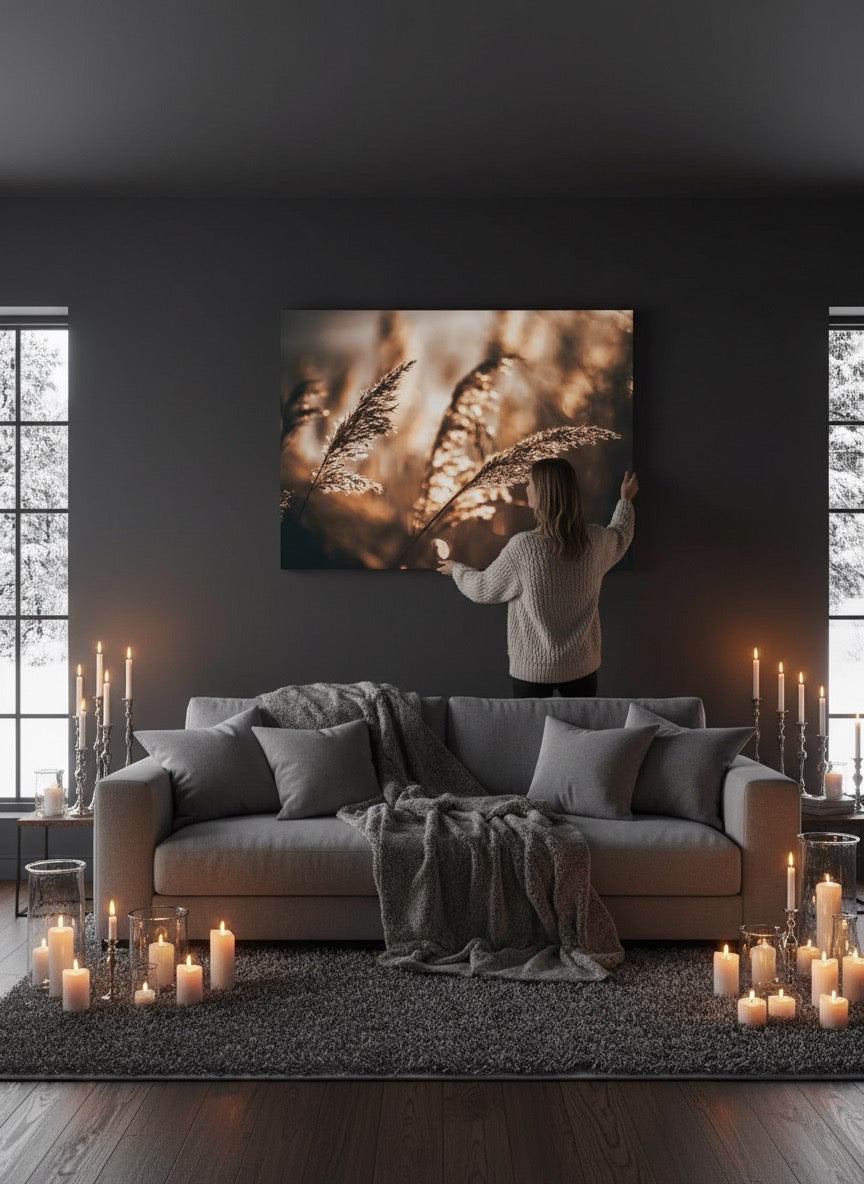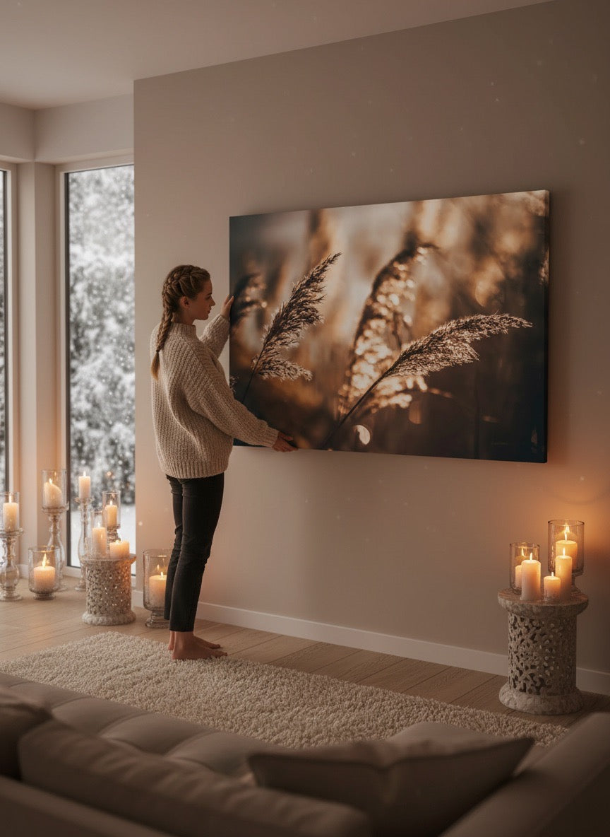 Nydelig kunstbilde av strå i sola ved vannet i varme toner. Få et vakkert og stilig motiv på veggen med dette fine veggbildet.