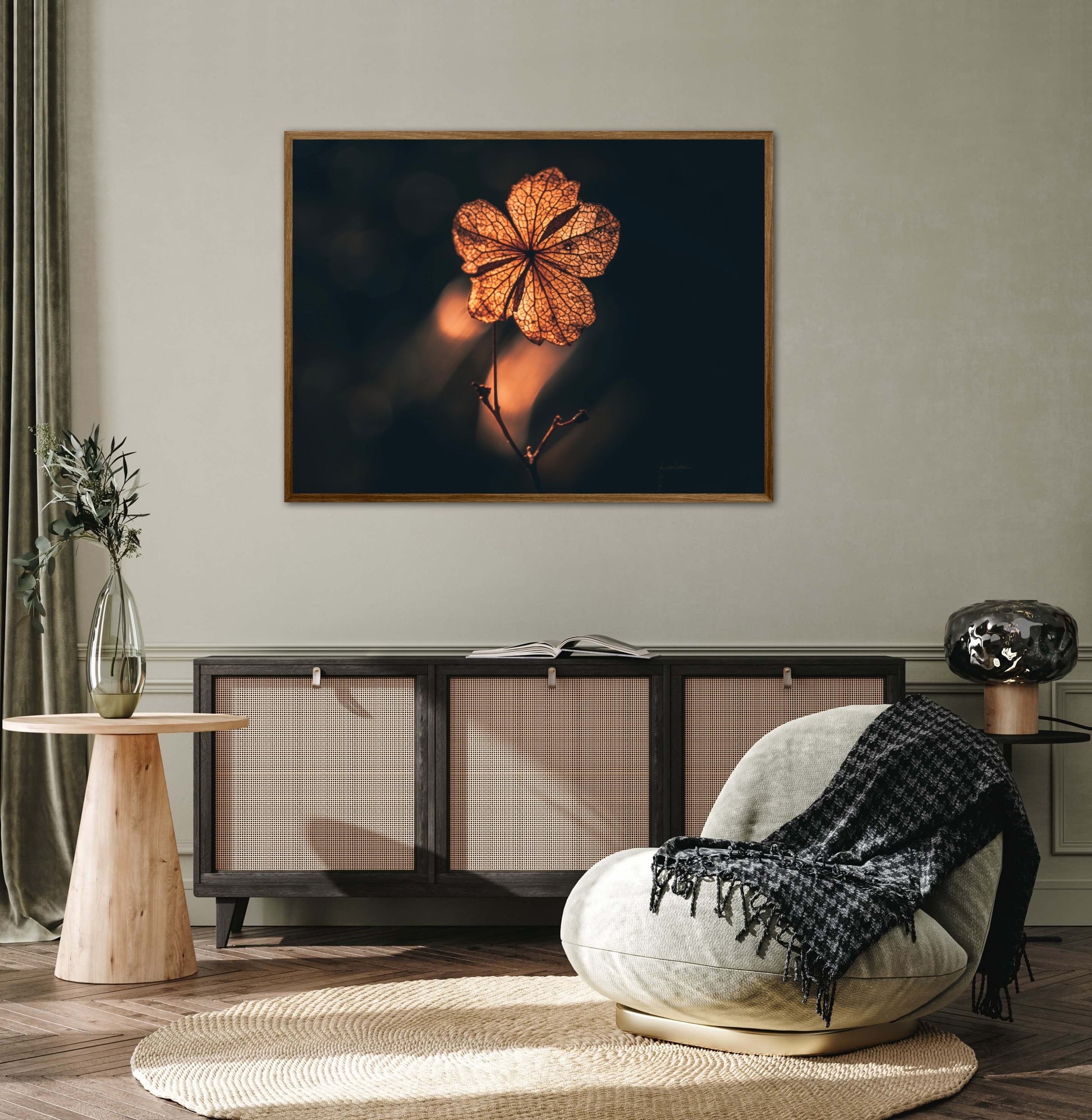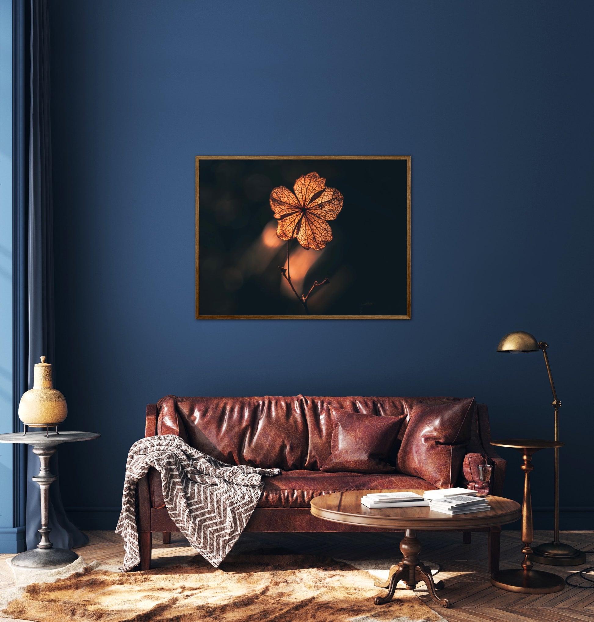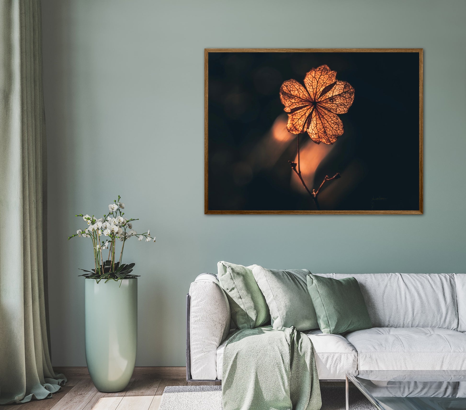 Nydelig vakkert syrinhortensia blad i lune, varme bruntoner med gyllent lys i bakgrunnen. Dette bildet vil gi varme til ditt hjem og lyse opp ethvert rom.