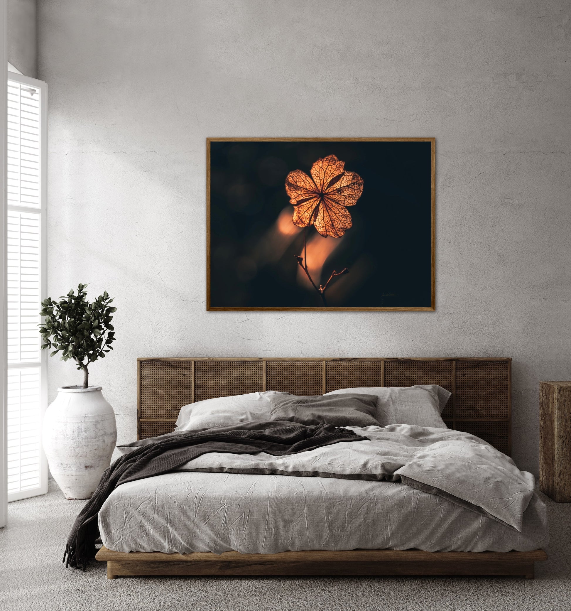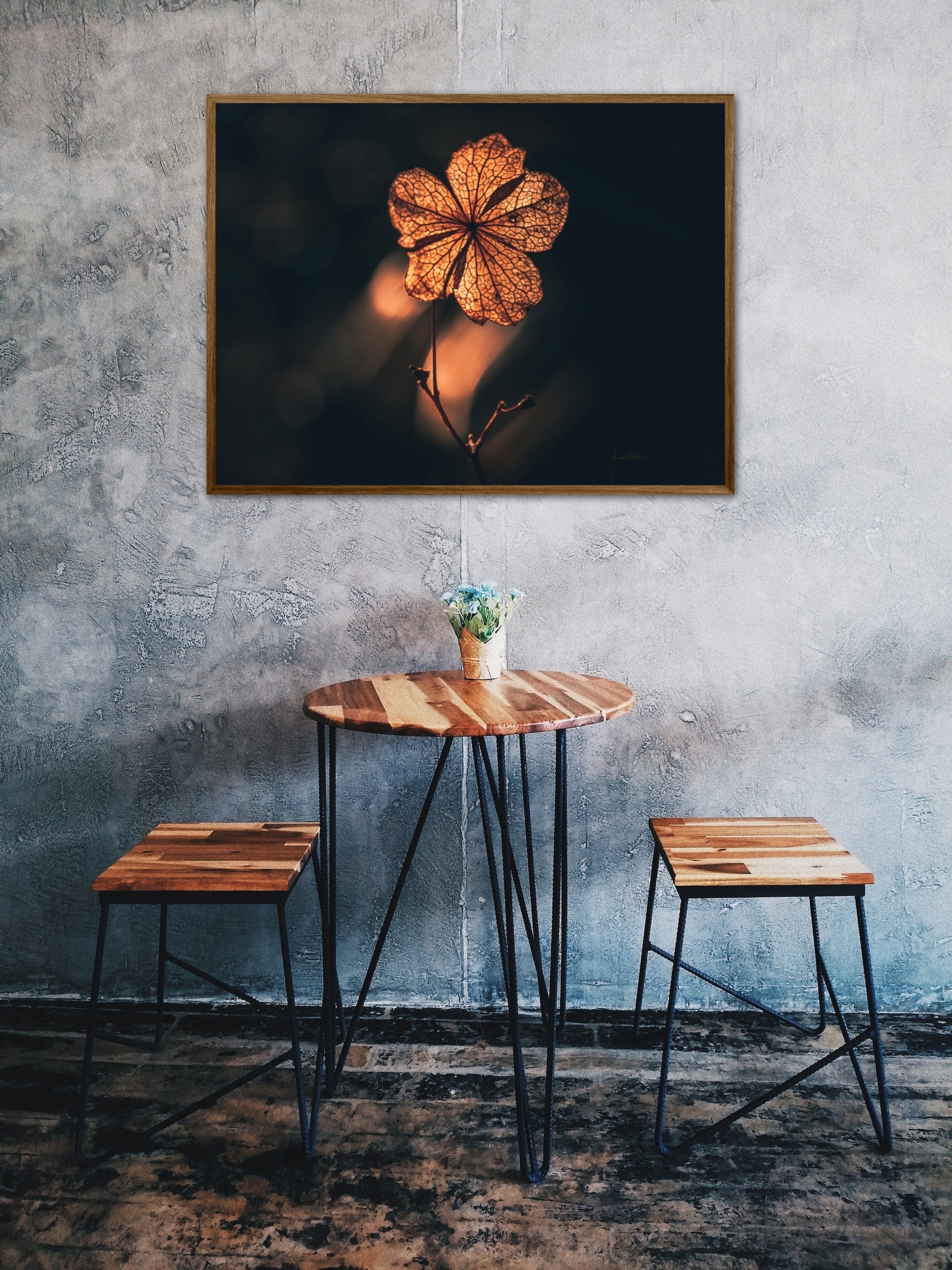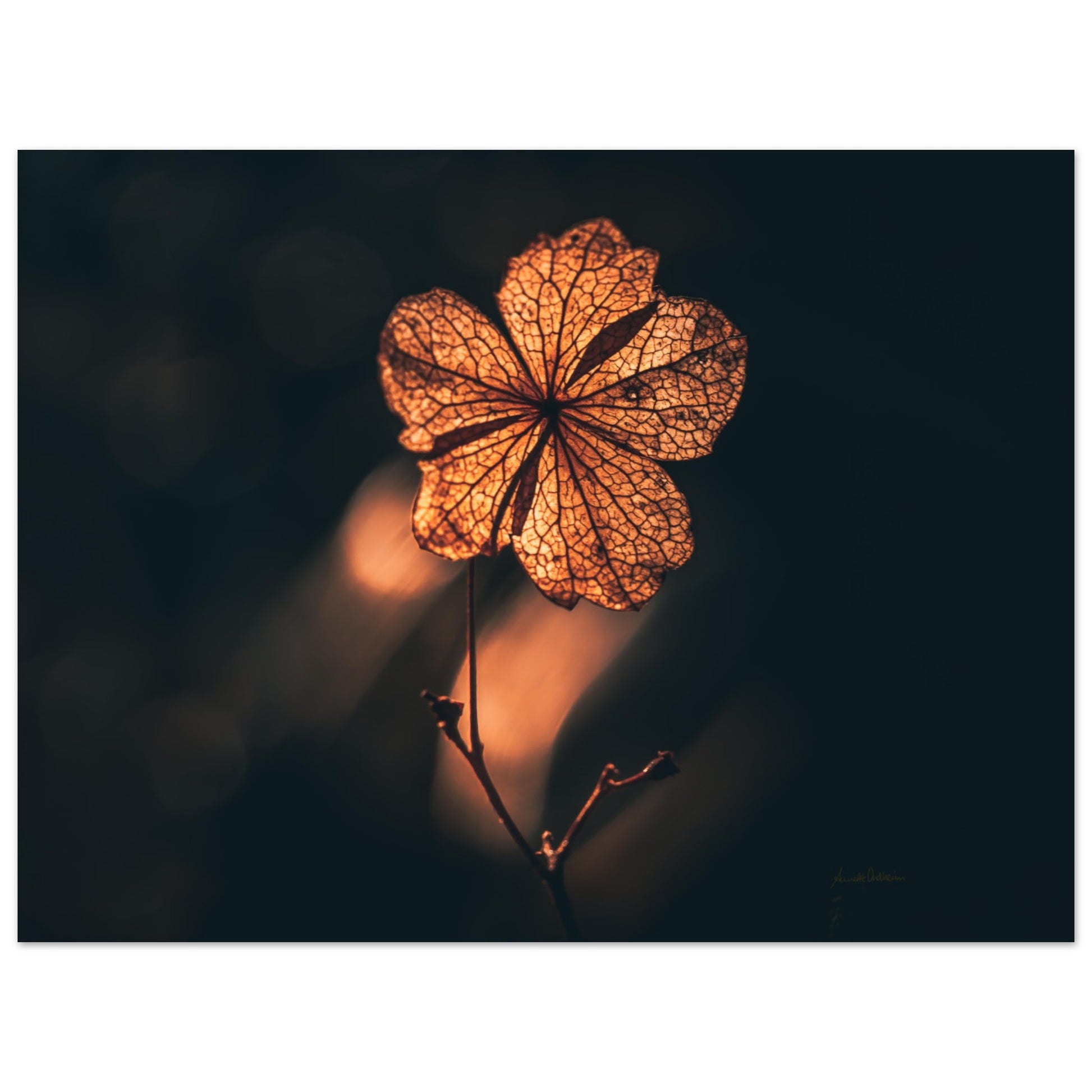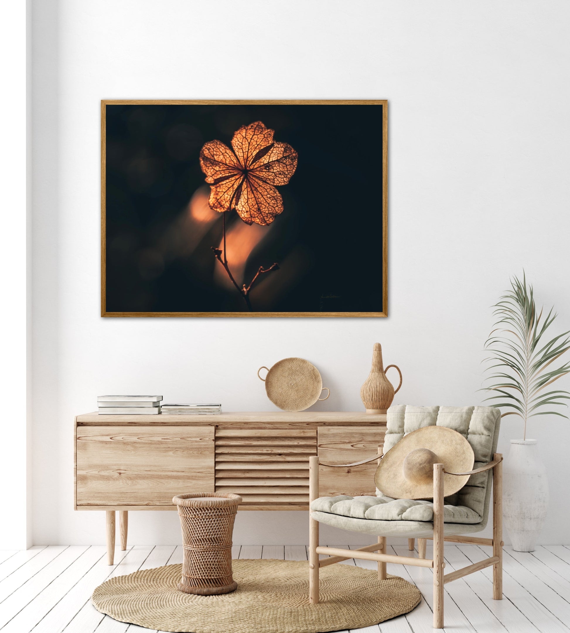 Nydelig vakkert syrinhortensia blad i lune, varme bruntoner med gyllent lys i bakgrunnen. Dette bildet vil gi varme til ditt hjem og lyse opp ethvert rom.