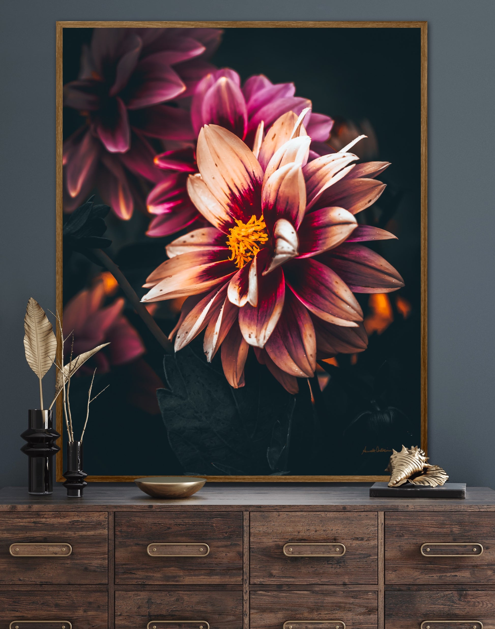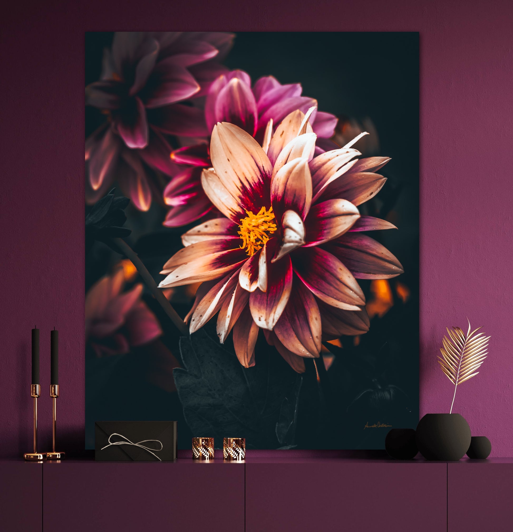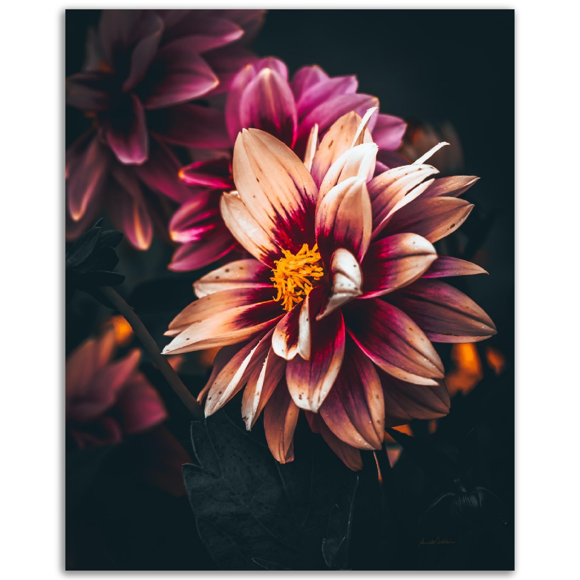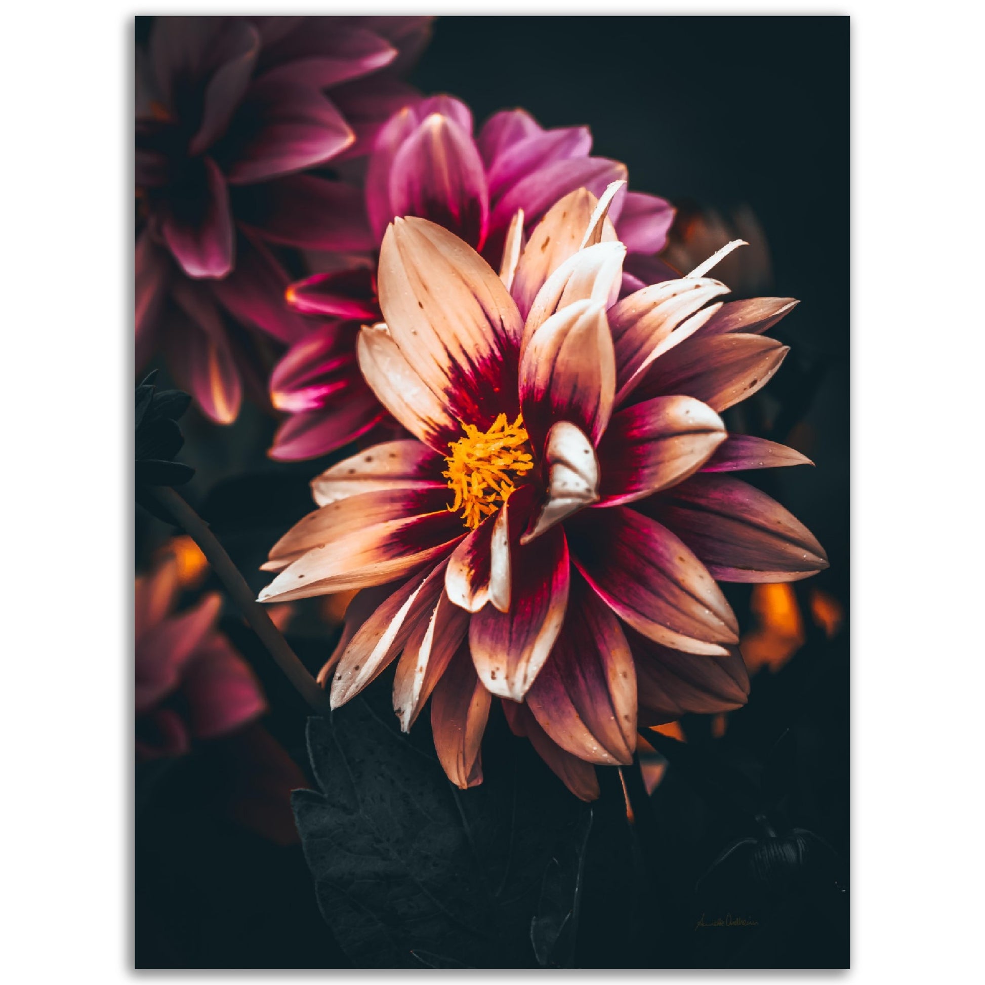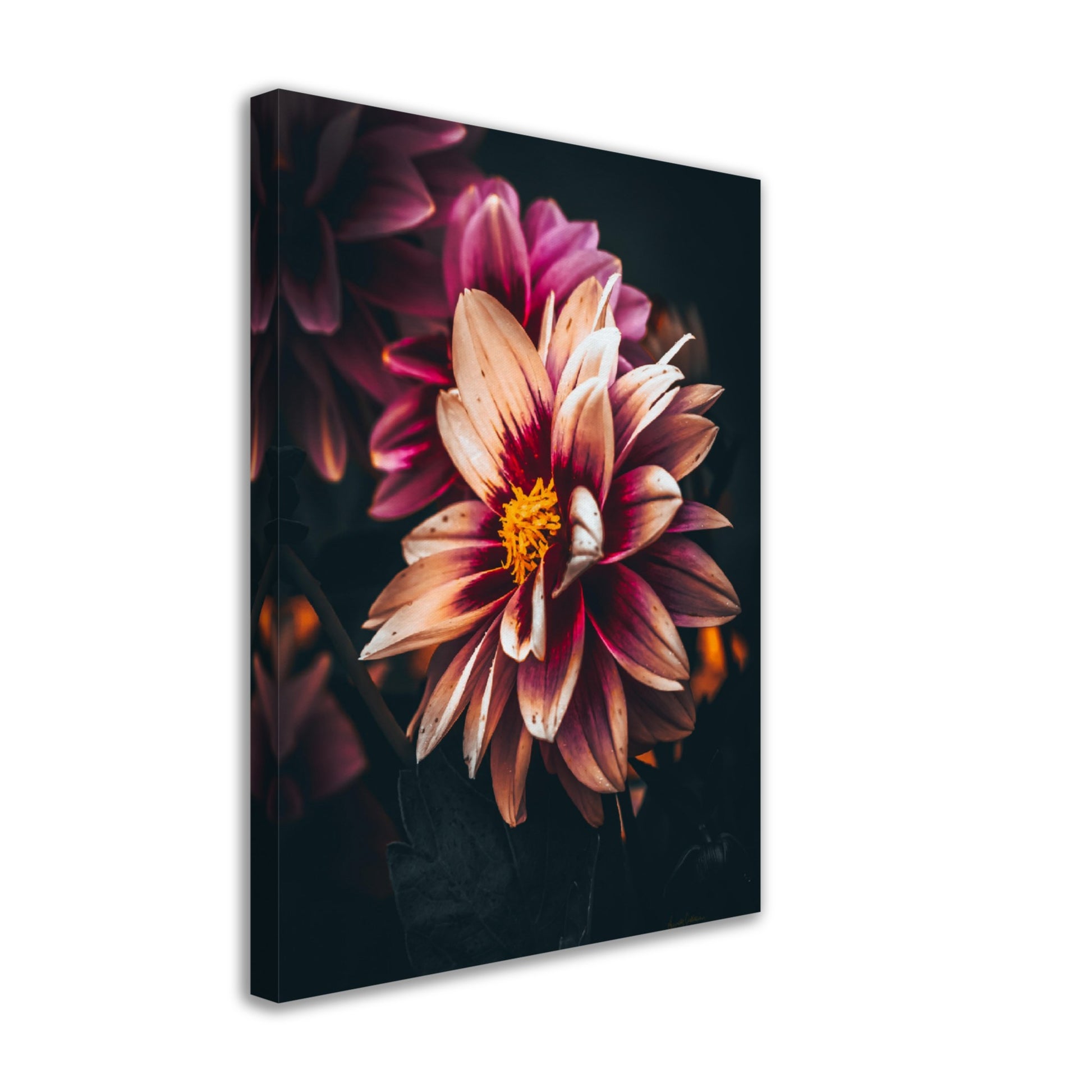 Nydelig vakkert kunstbilde av en Dahlia blomst i vakre rosatoner på mørk bakgrunn. Få et nydelig og spesielt bilde på veggen med dette fine motivet.