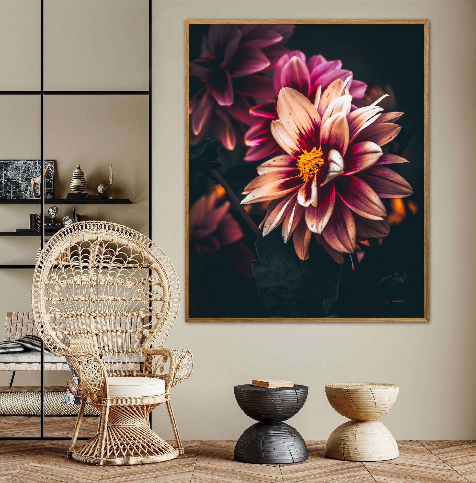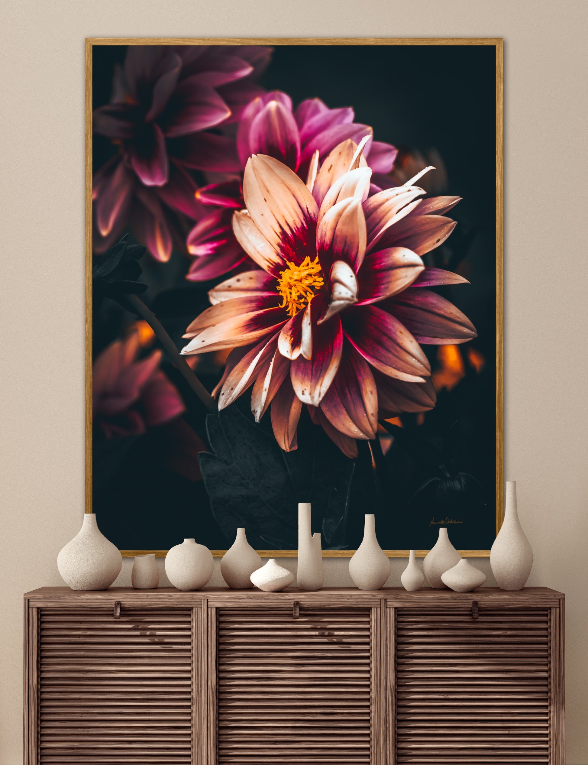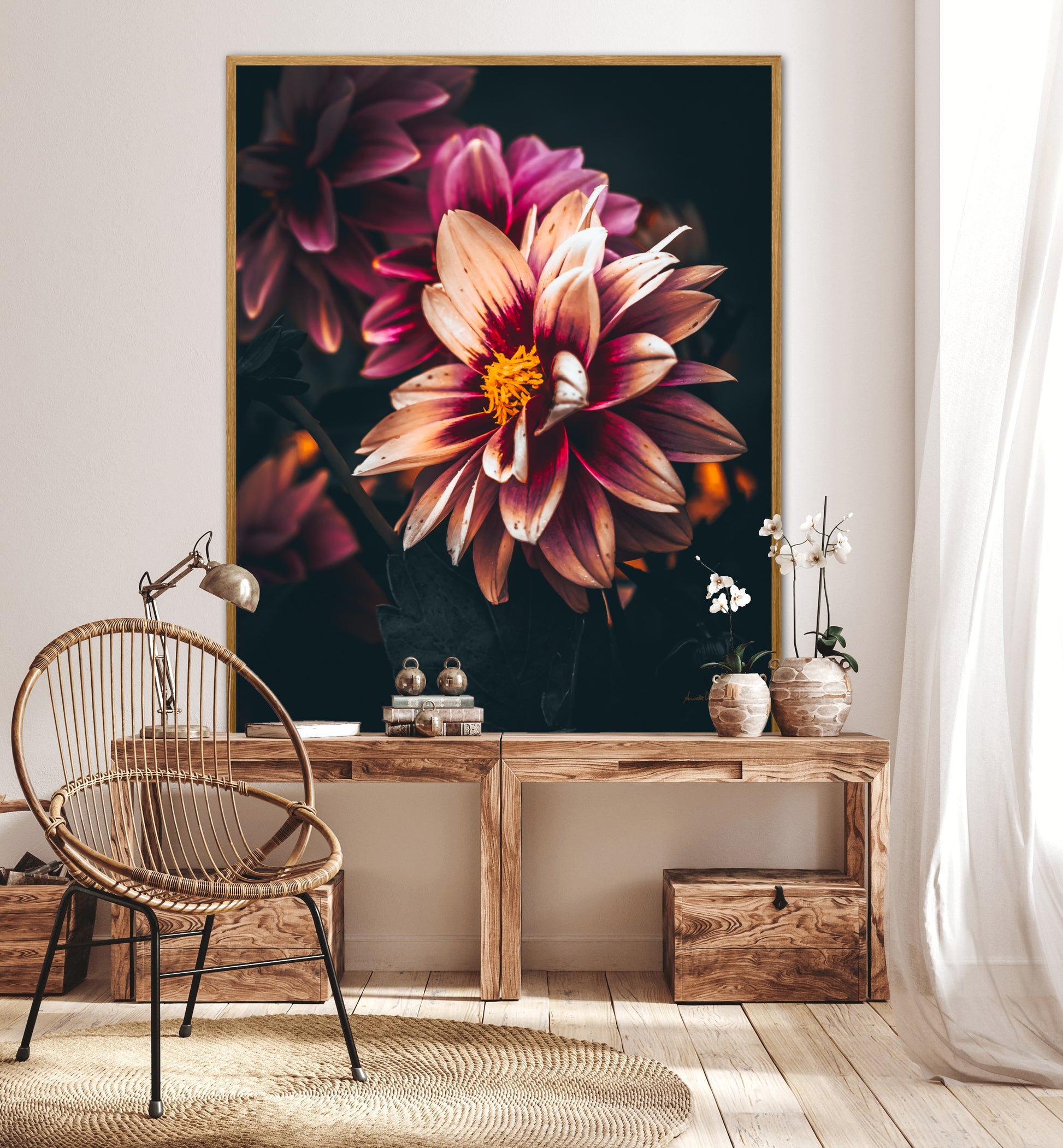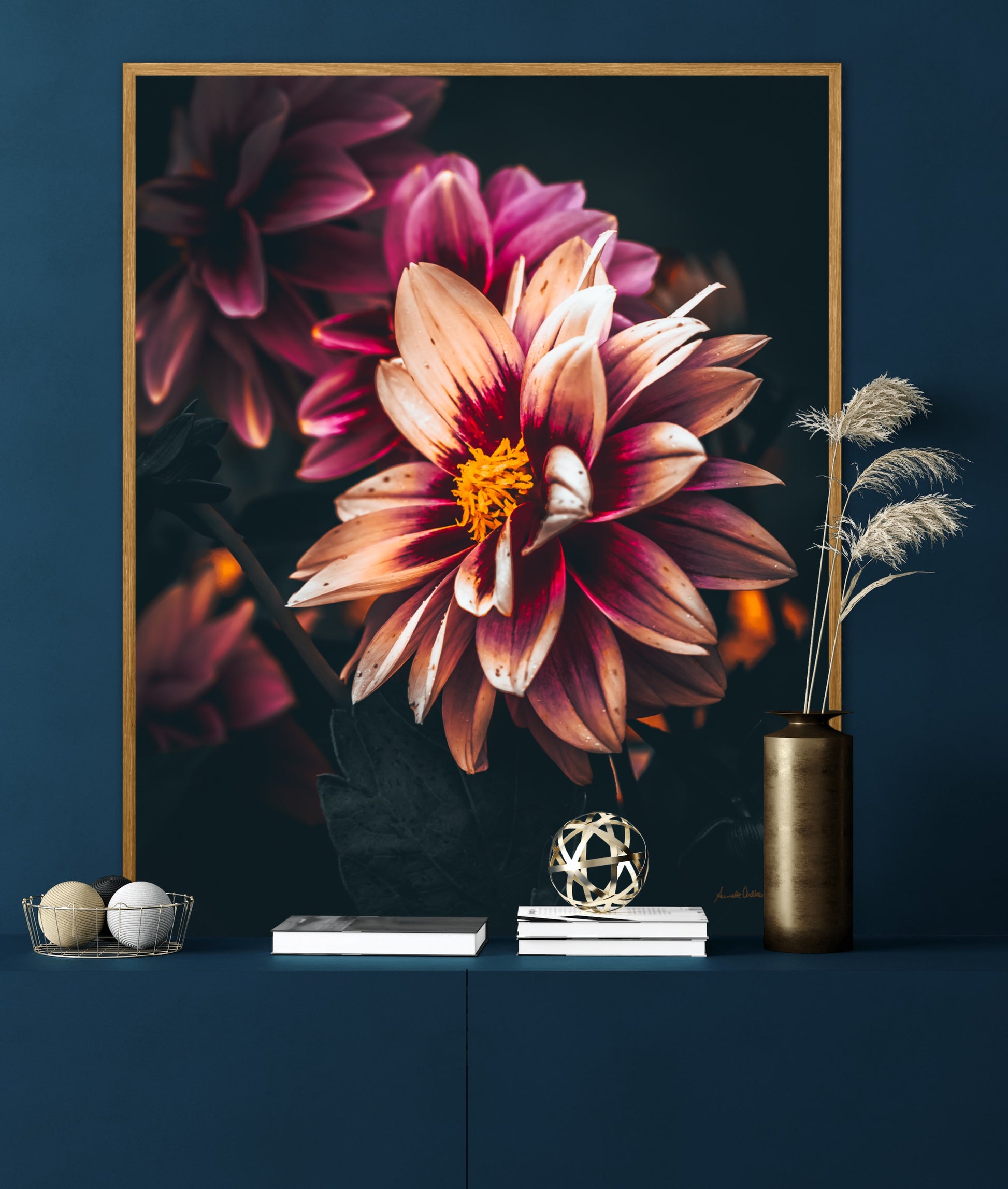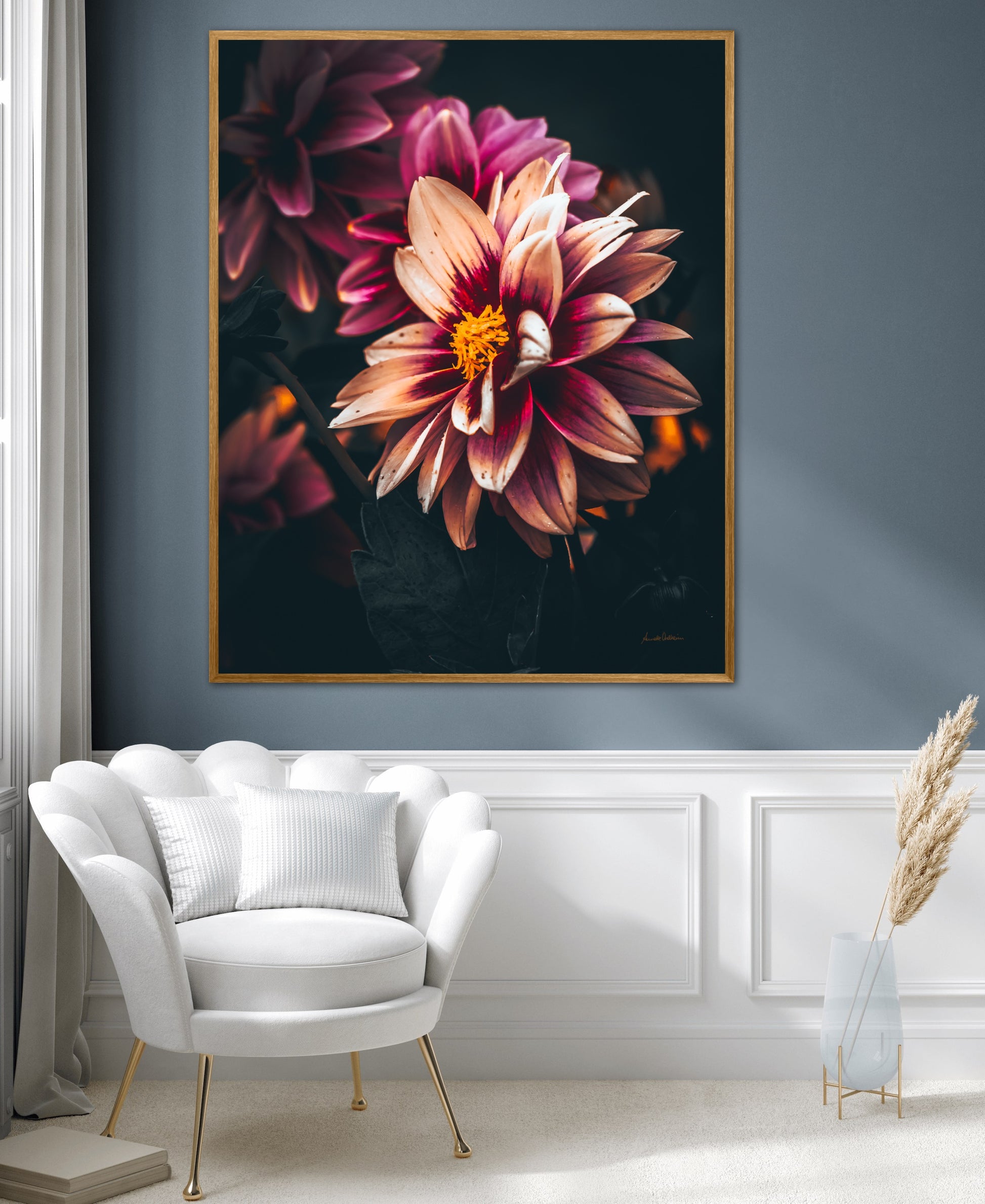 Nydelig vakkert kunstbilde av en Dahlia blomst i vakre rosatoner på mørk bakgrunn. Få et nydelig og spesielt bilde på veggen med dette fine motivet.