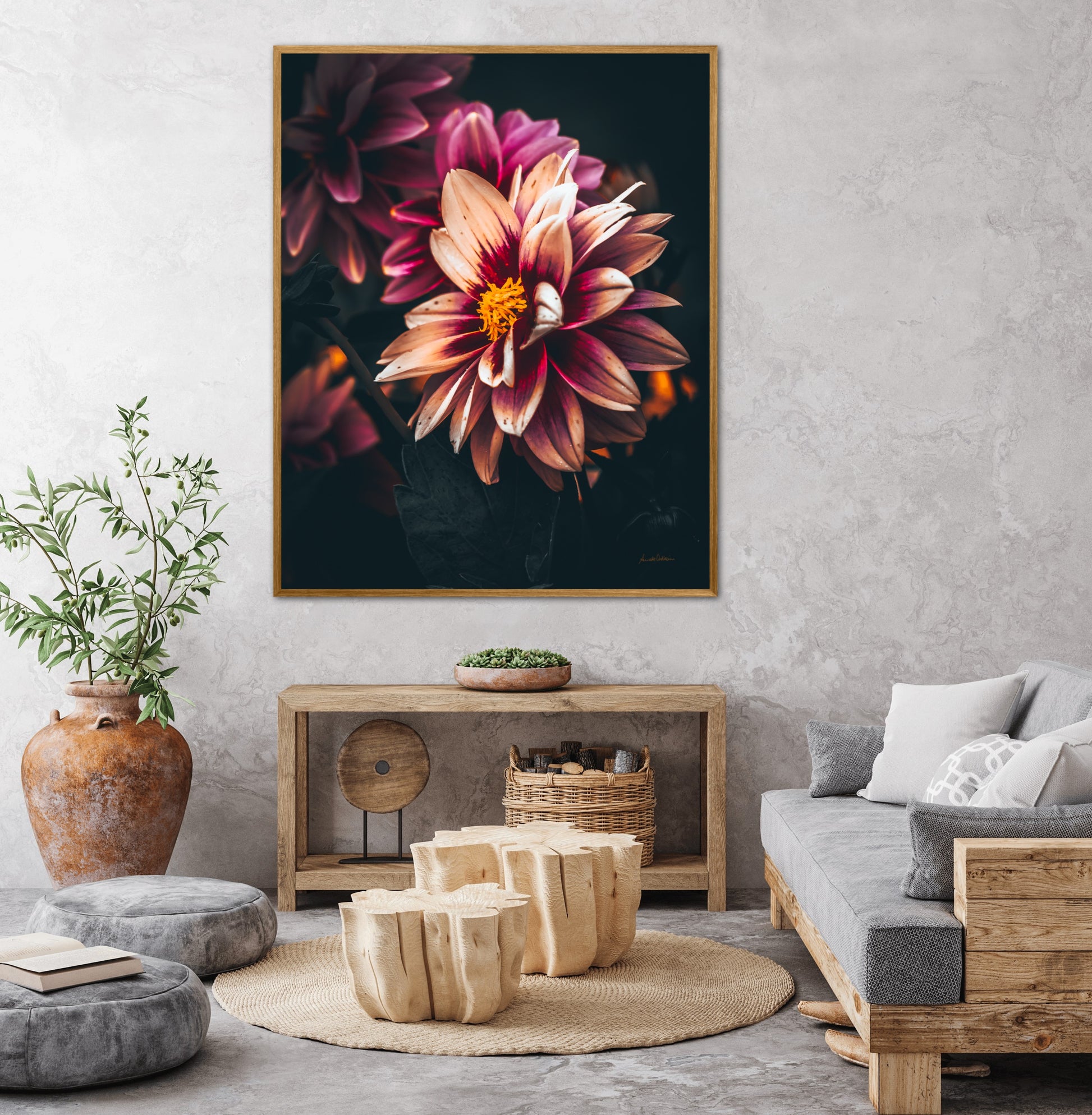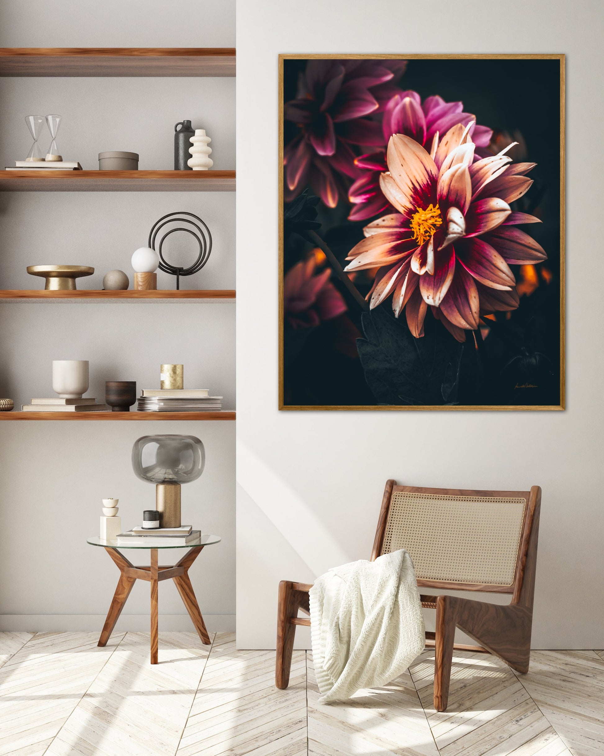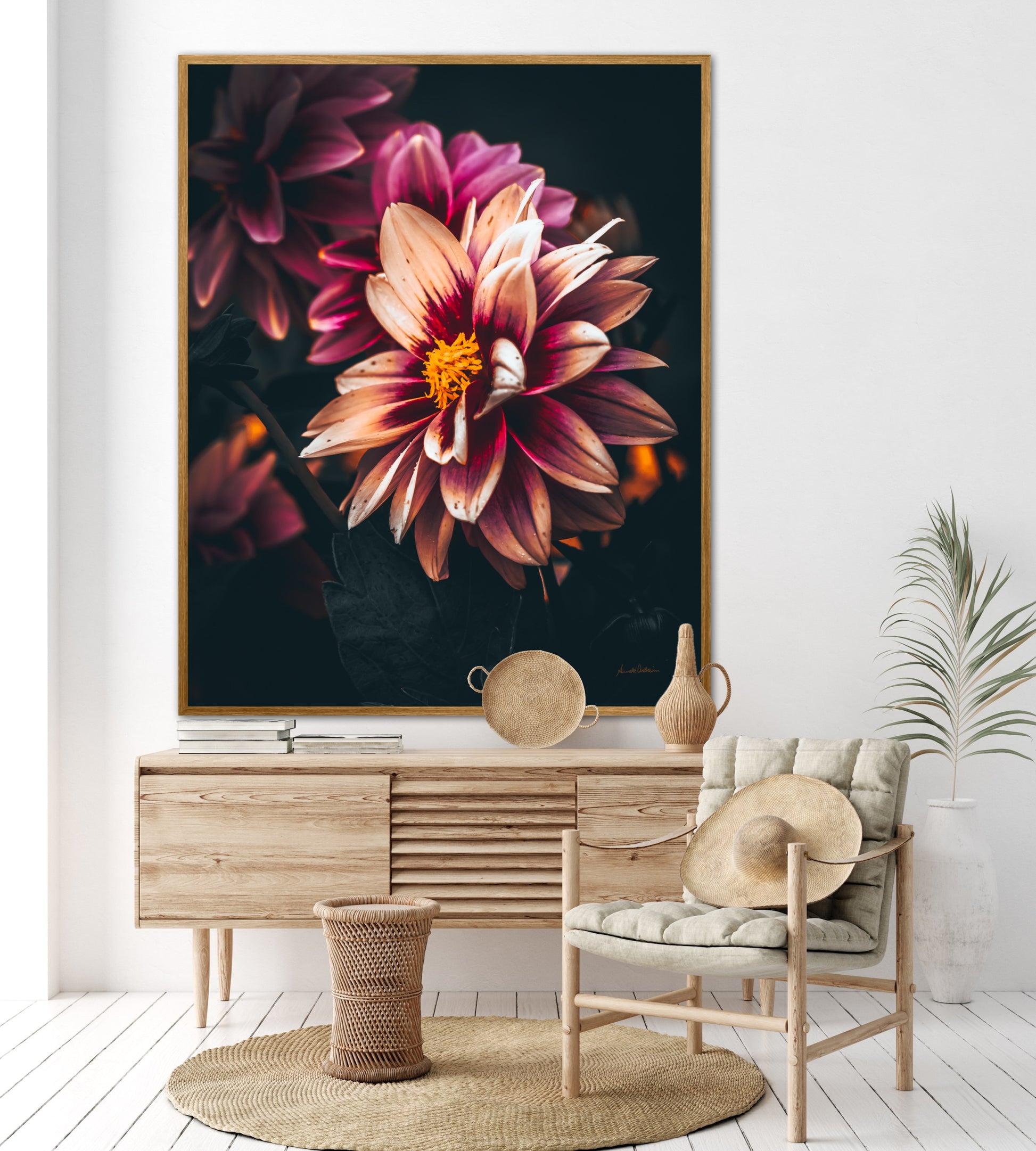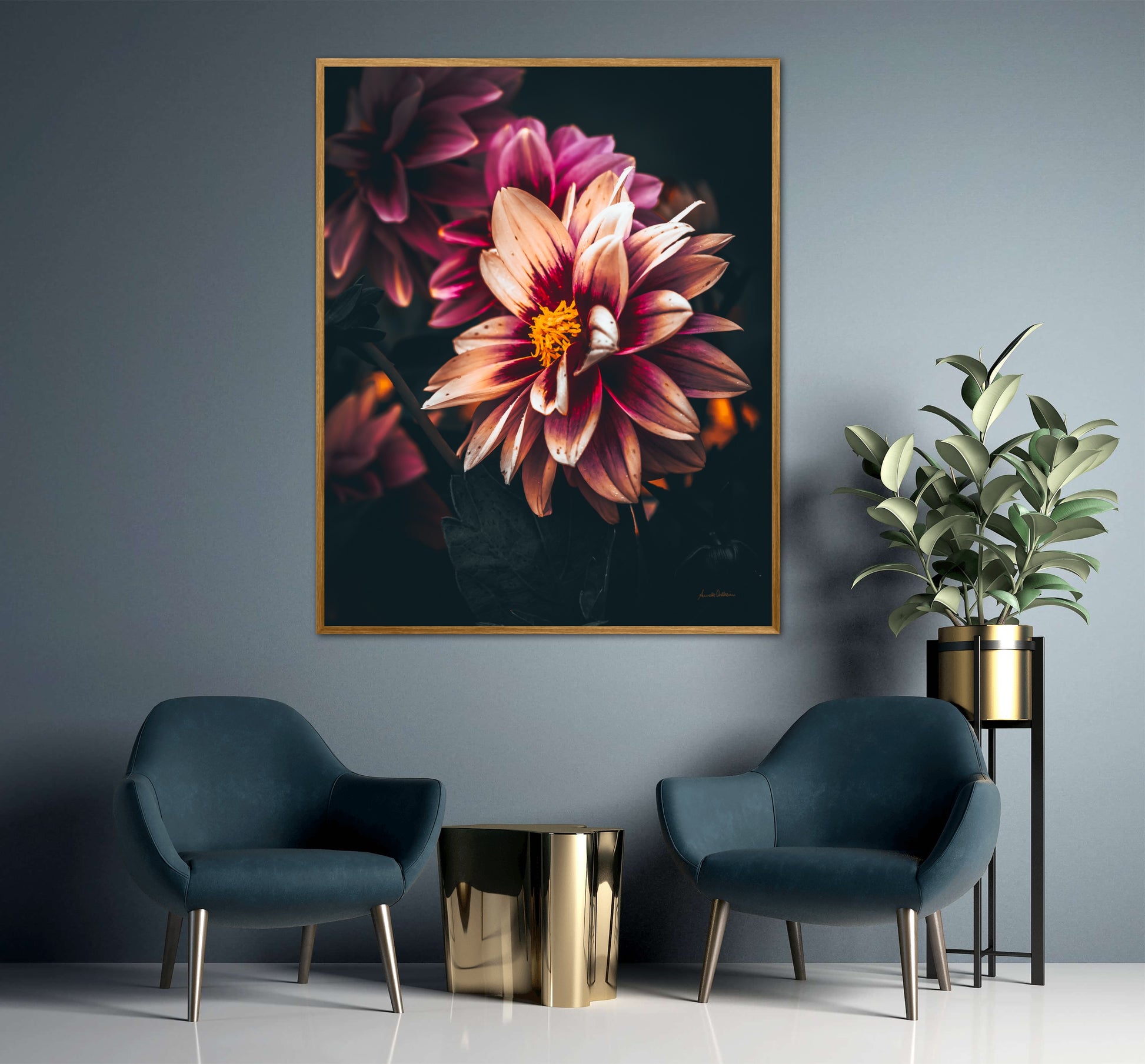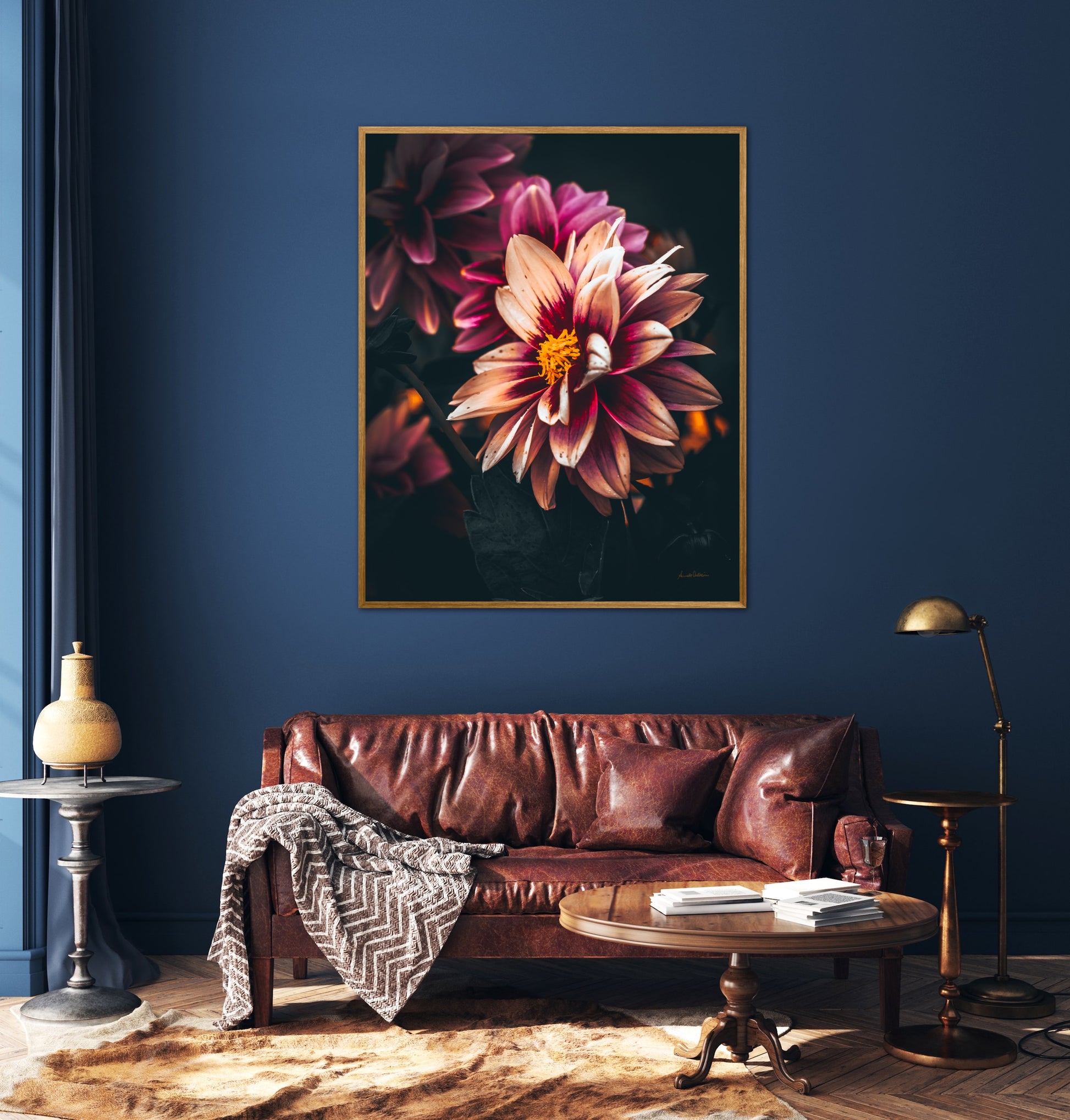 Nydelig vakkert kunstbilde av en Dahlia blomst i vakre rosatoner på mørk bakgrunn. Få et nydelig og spesielt bilde på veggen med dette fine motivet.