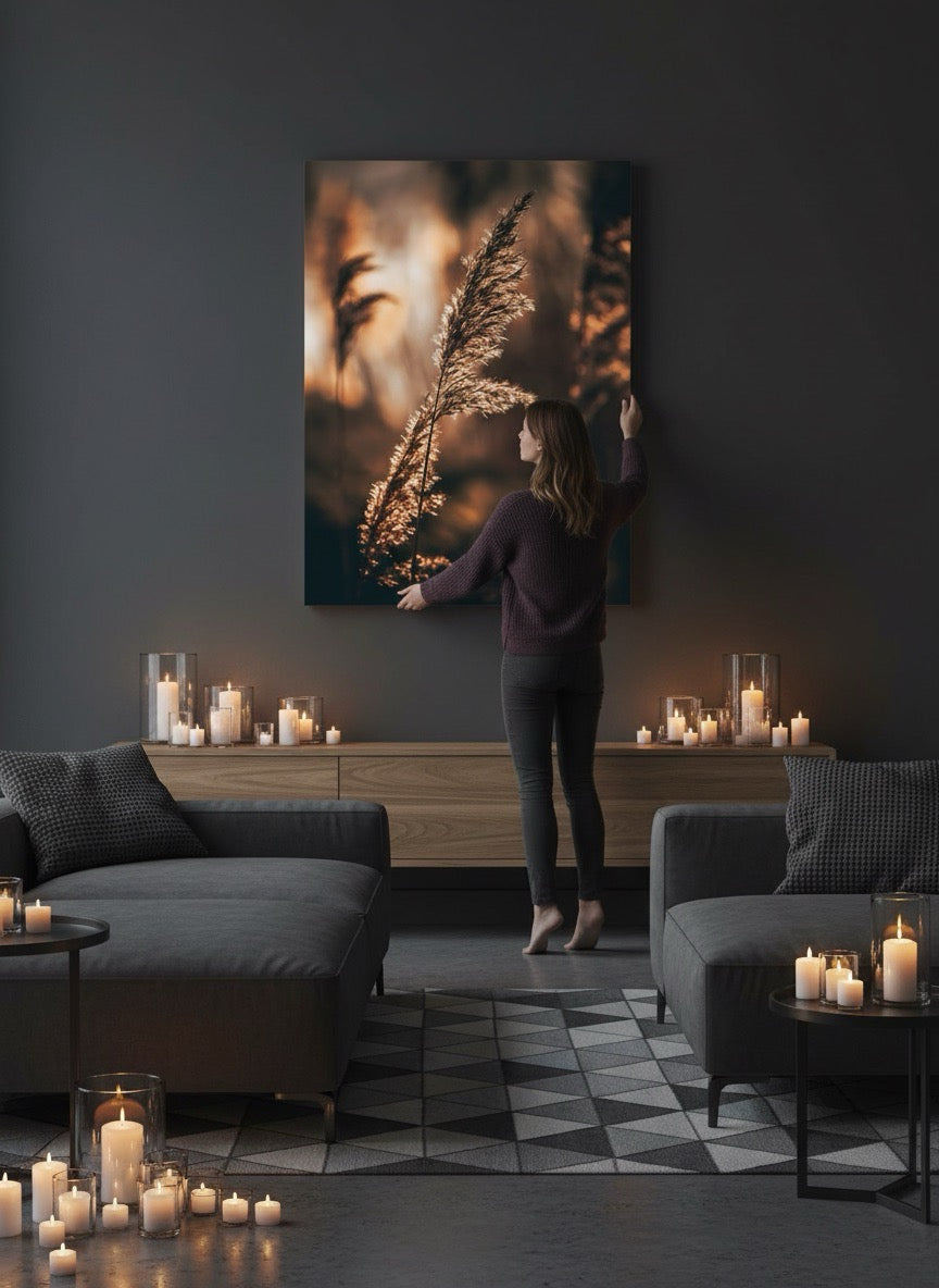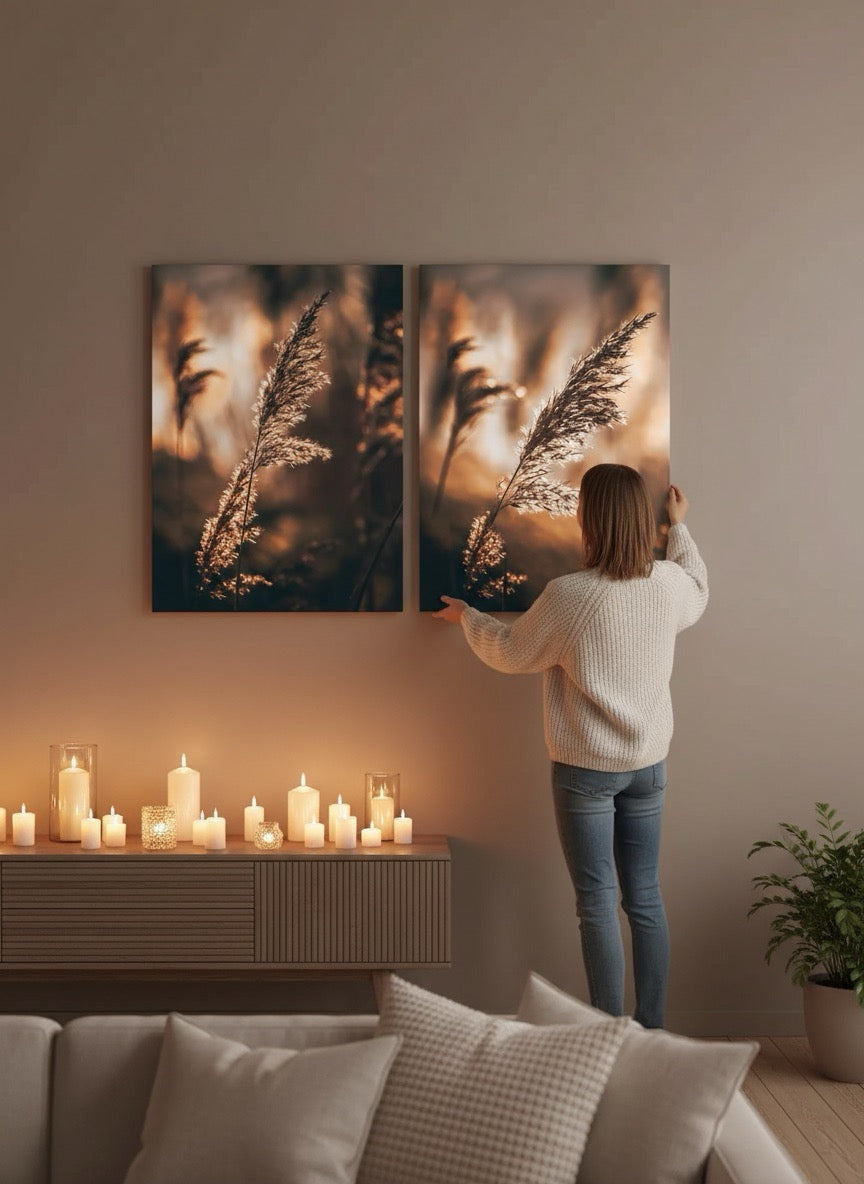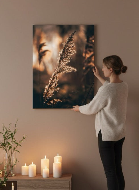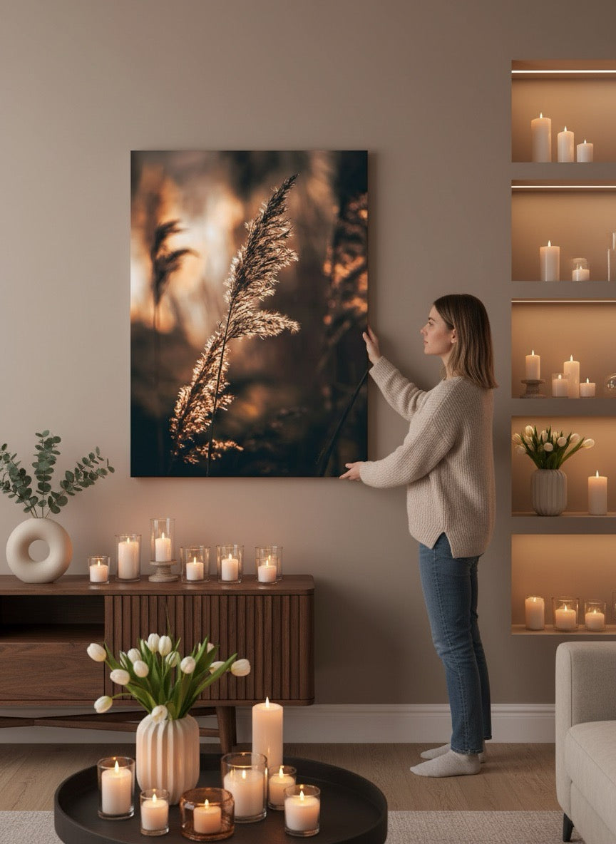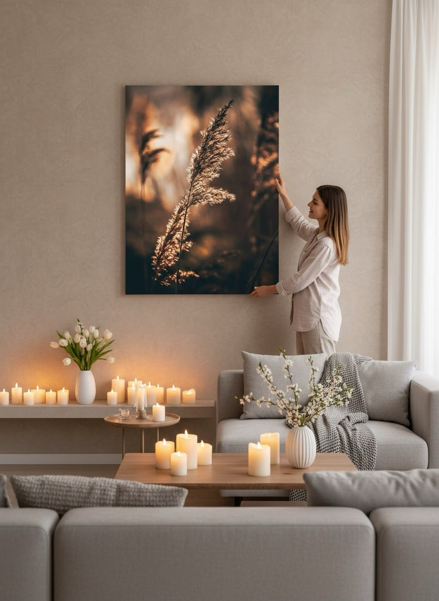 Nydelig kunstbilde av strå i sola ved vannet i varme toner. Få et vakkert og stilig motiv på veggen med dette fine veggbildet.