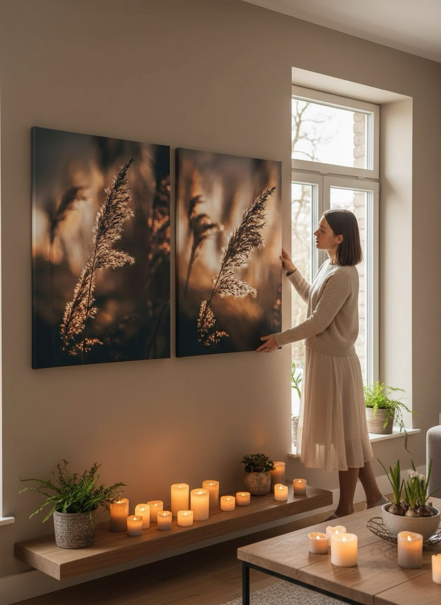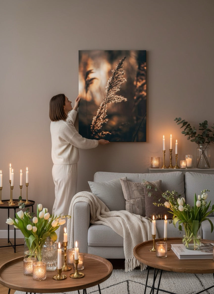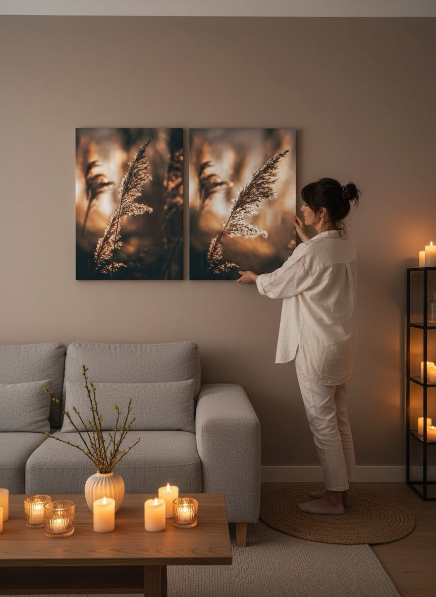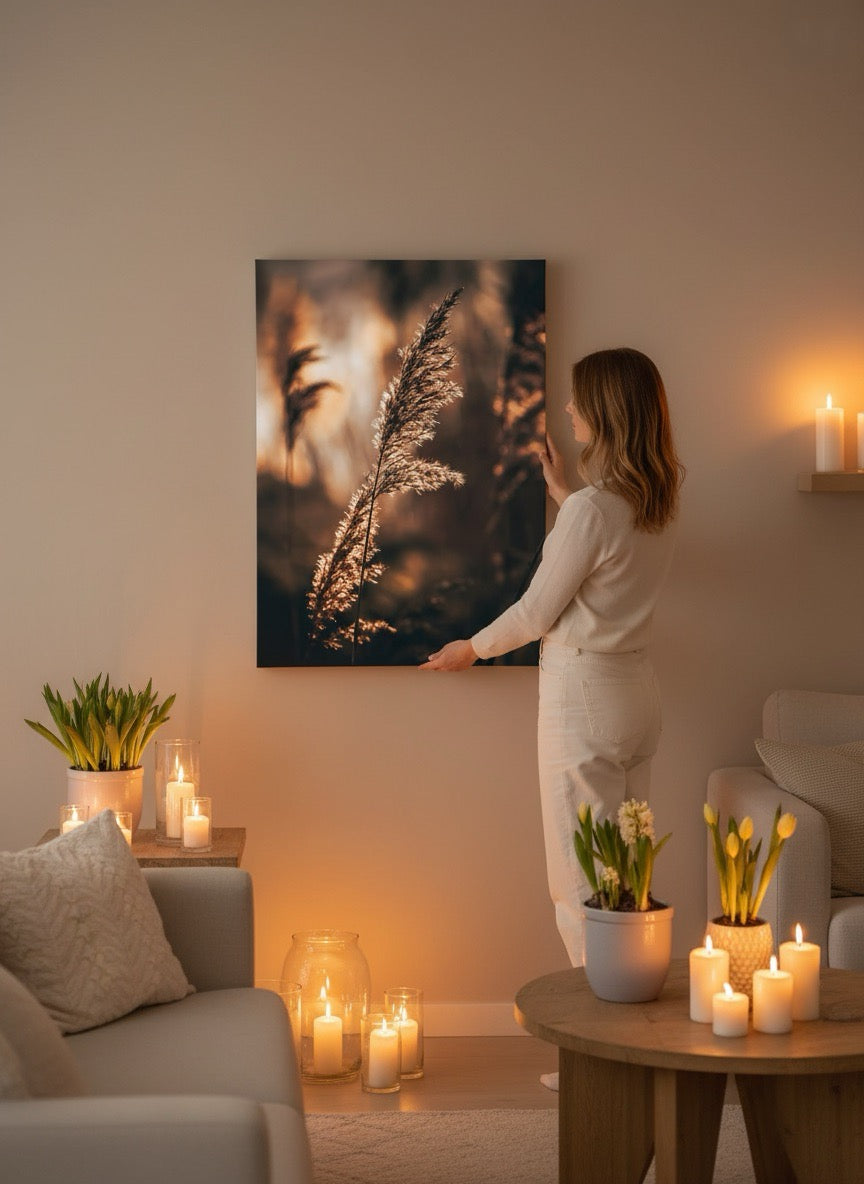Nydelig kunstbilde av strå i sola ved vannet i varme toner. Få et vakkert og stilig motiv på veggen med dette fine veggbildet.