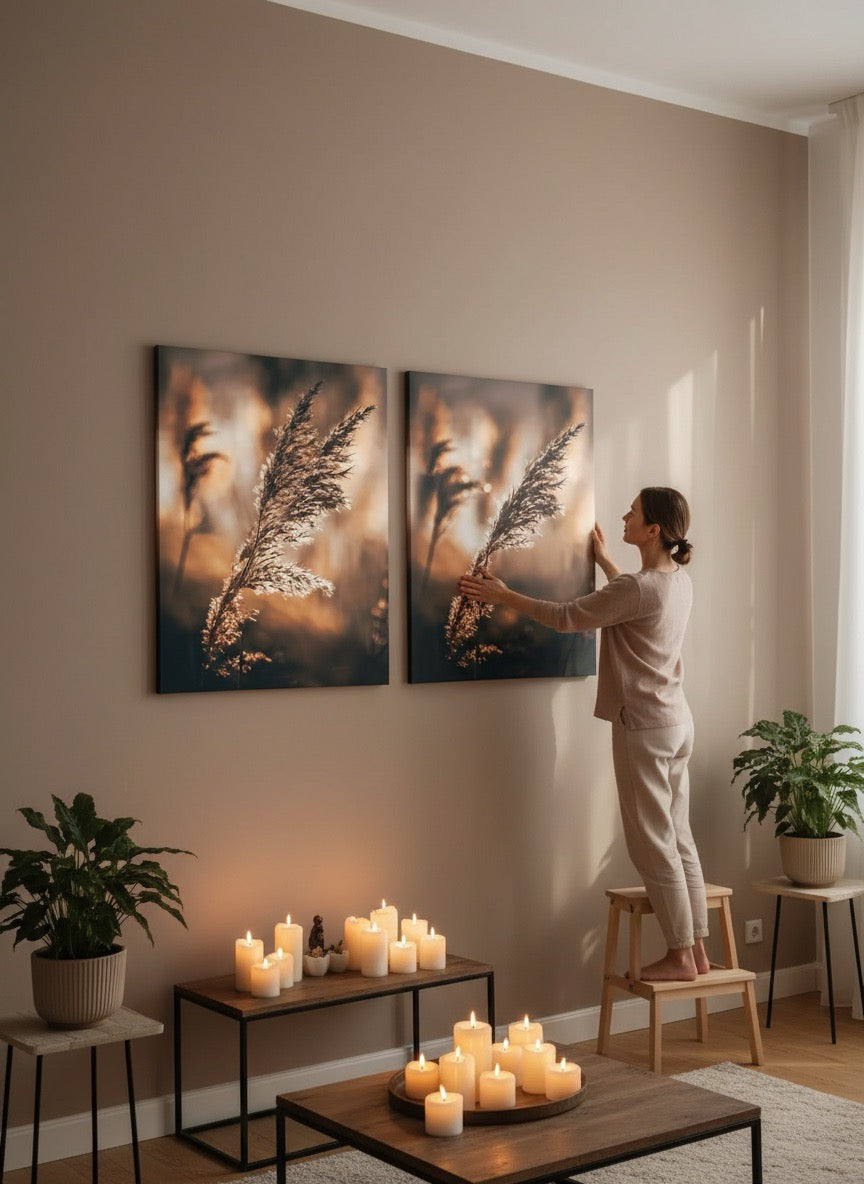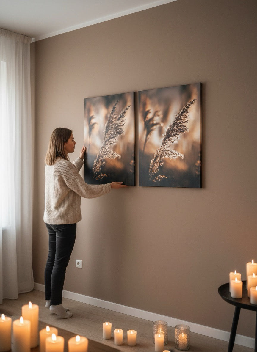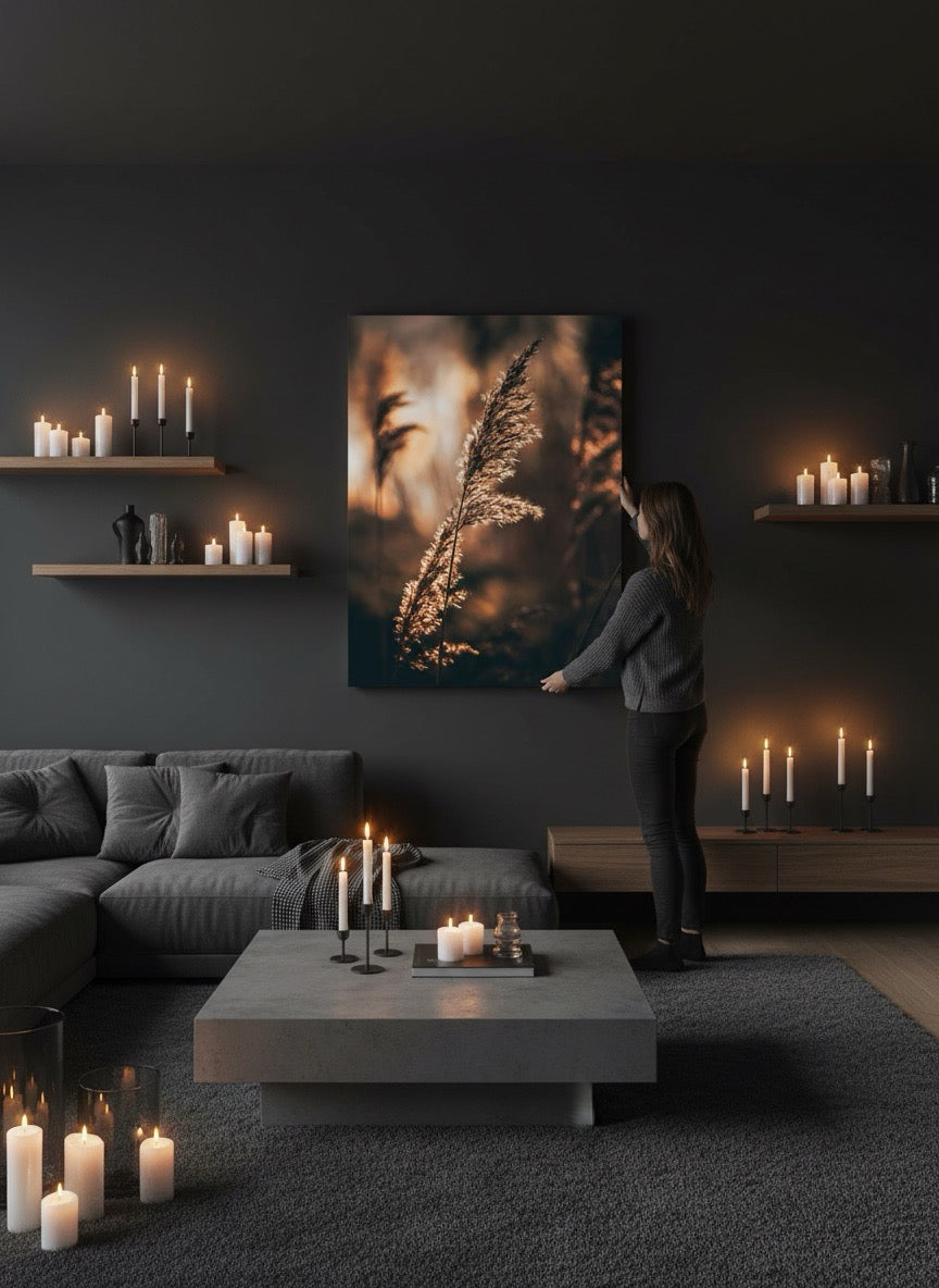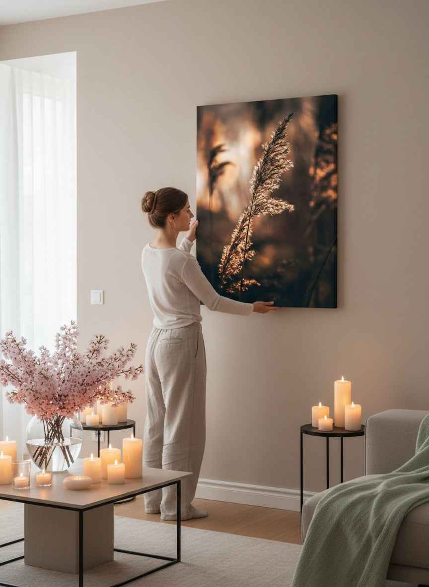 Nydelig kunstbilde av strå i sola ved vannet i varme toner. Få et vakkert og stilig motiv på veggen med dette fine veggbildet.