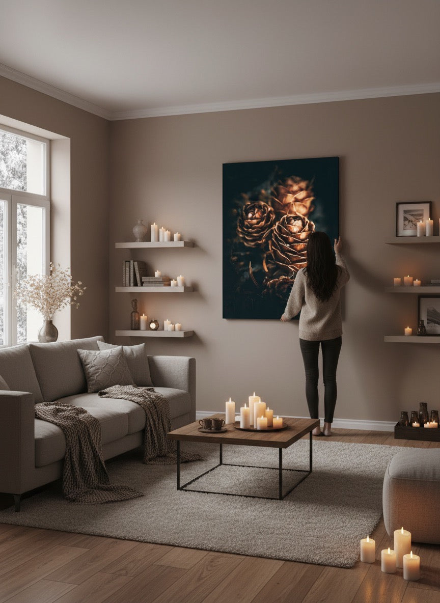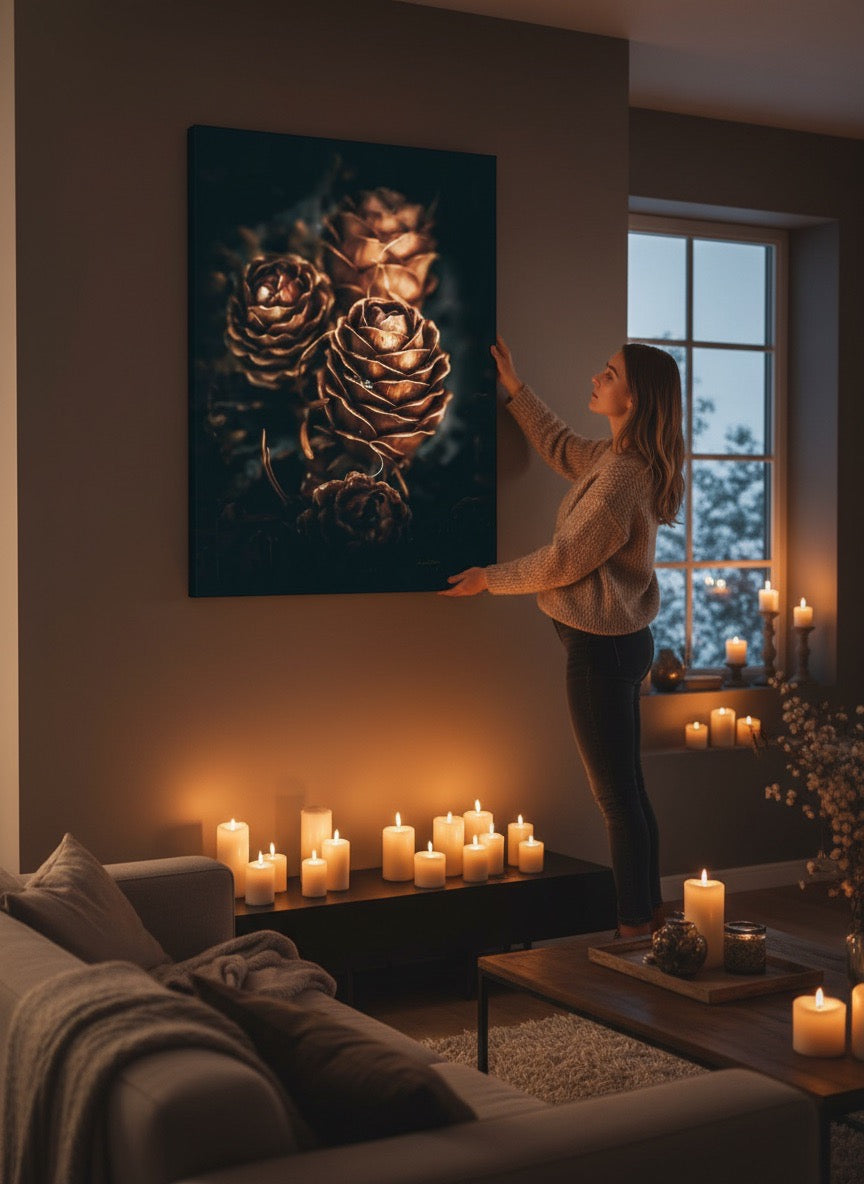 Nydelig kunstbilde av tre kongler som skinner så fint i gyldent lys. Fargene er vakre jordtoner og er veldig behagelige å se på. Dette veggbildet vil bli et flott smykke på veggen din. Det gir deg ro fra naturen, og vil imponere venner og familie. Få et nydelig kunstverk på veggen. Veggbildet passer spesielt godt på hytta.