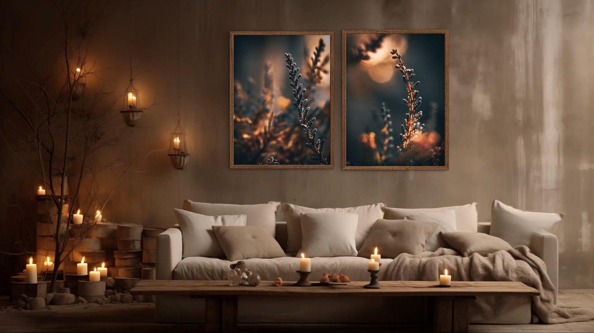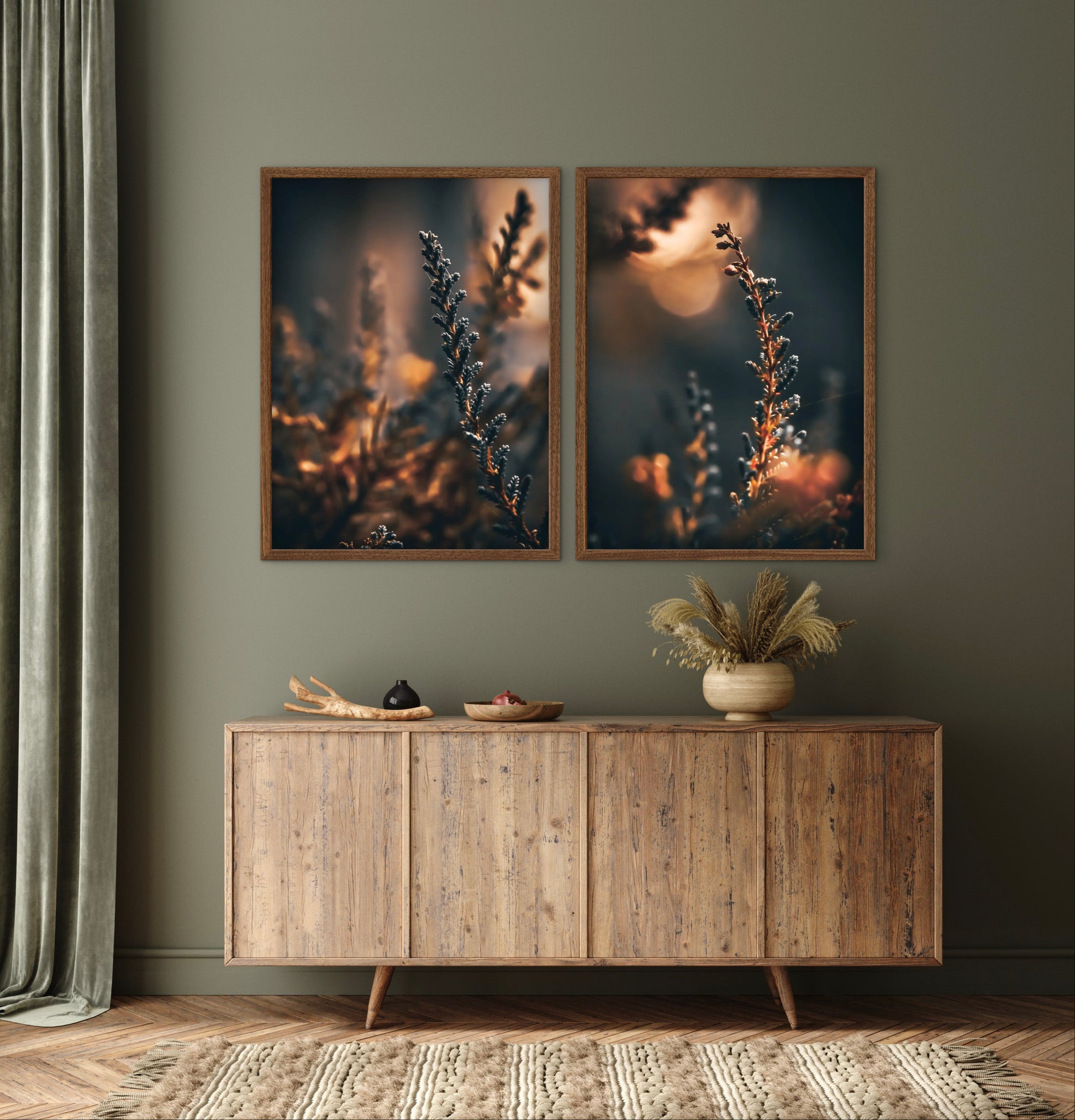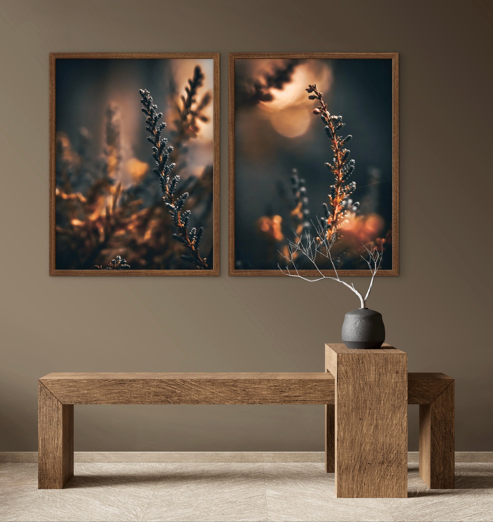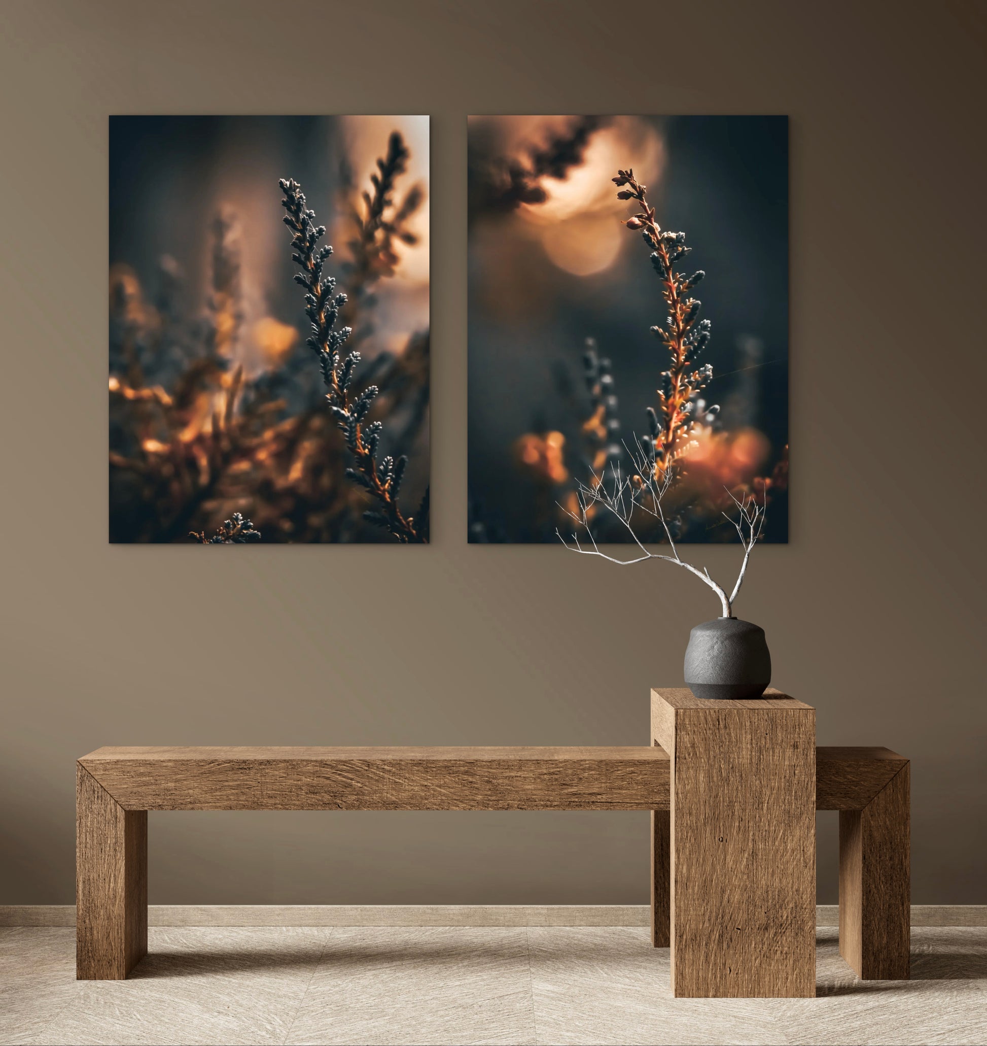 Nydelig kunstbilde av lyng i varme toner med vakkert baklys. Få et skikkelig stemningsbilde på veggen med dette vakre motivet.