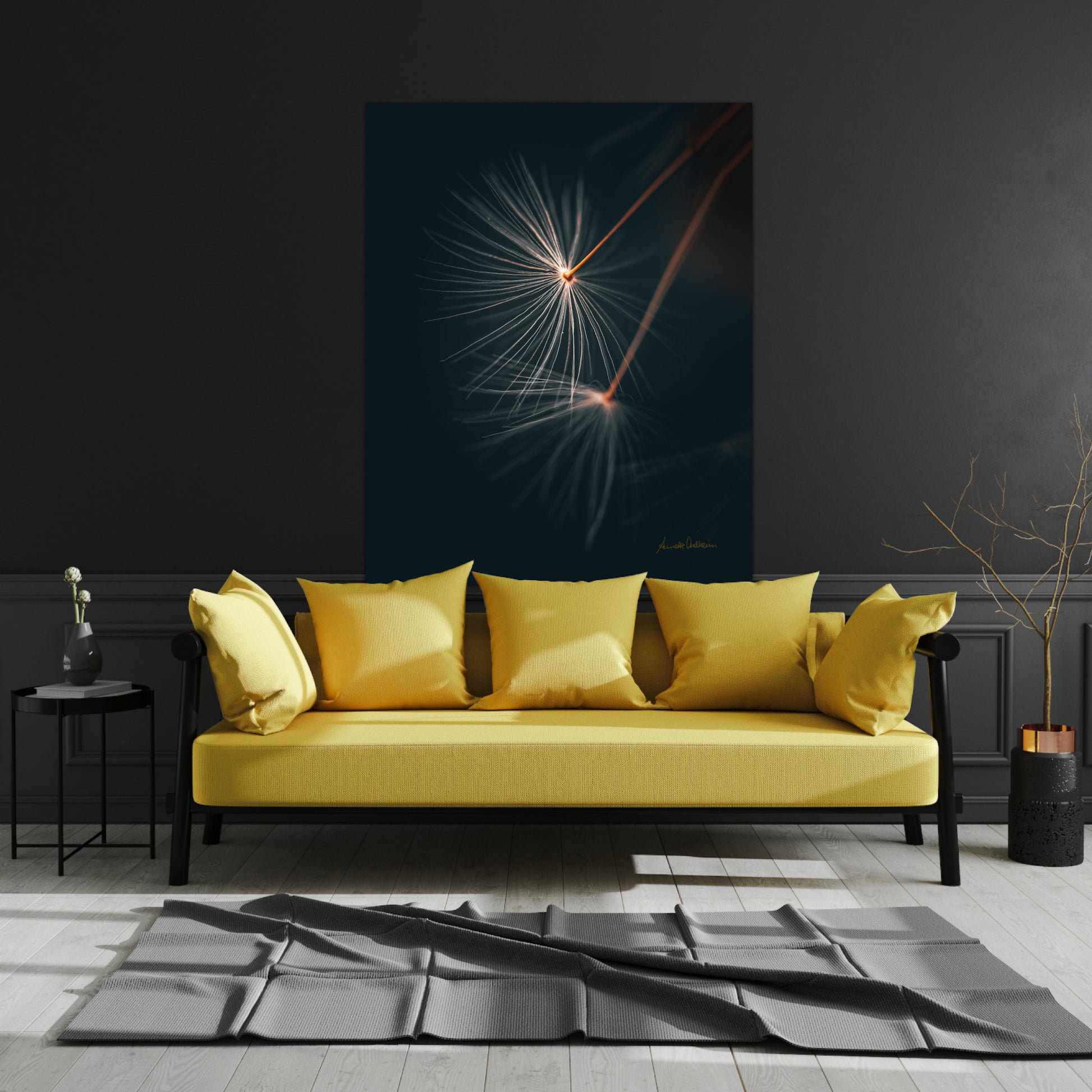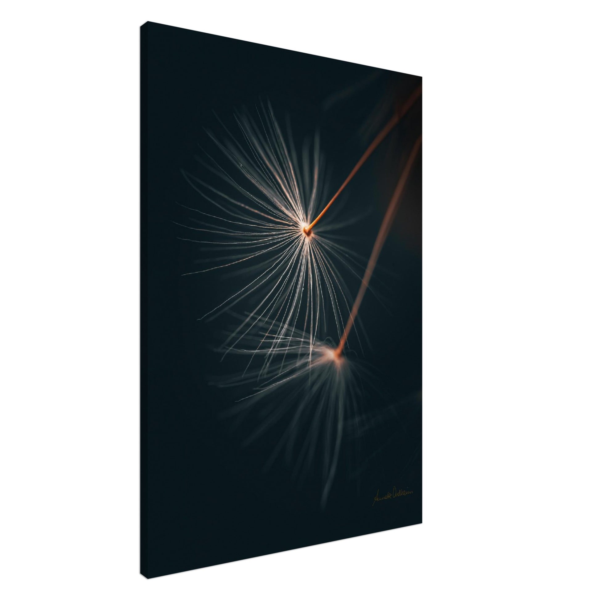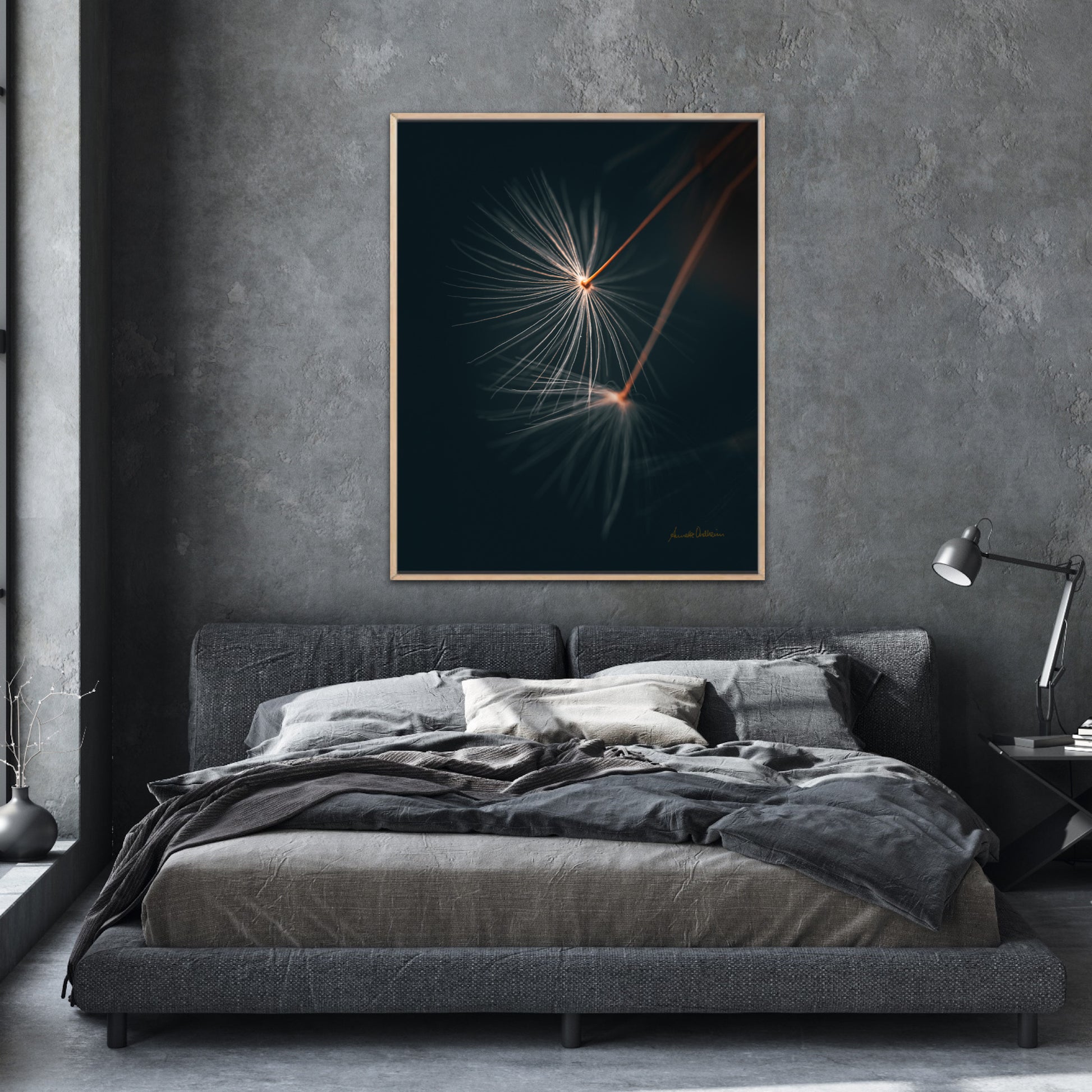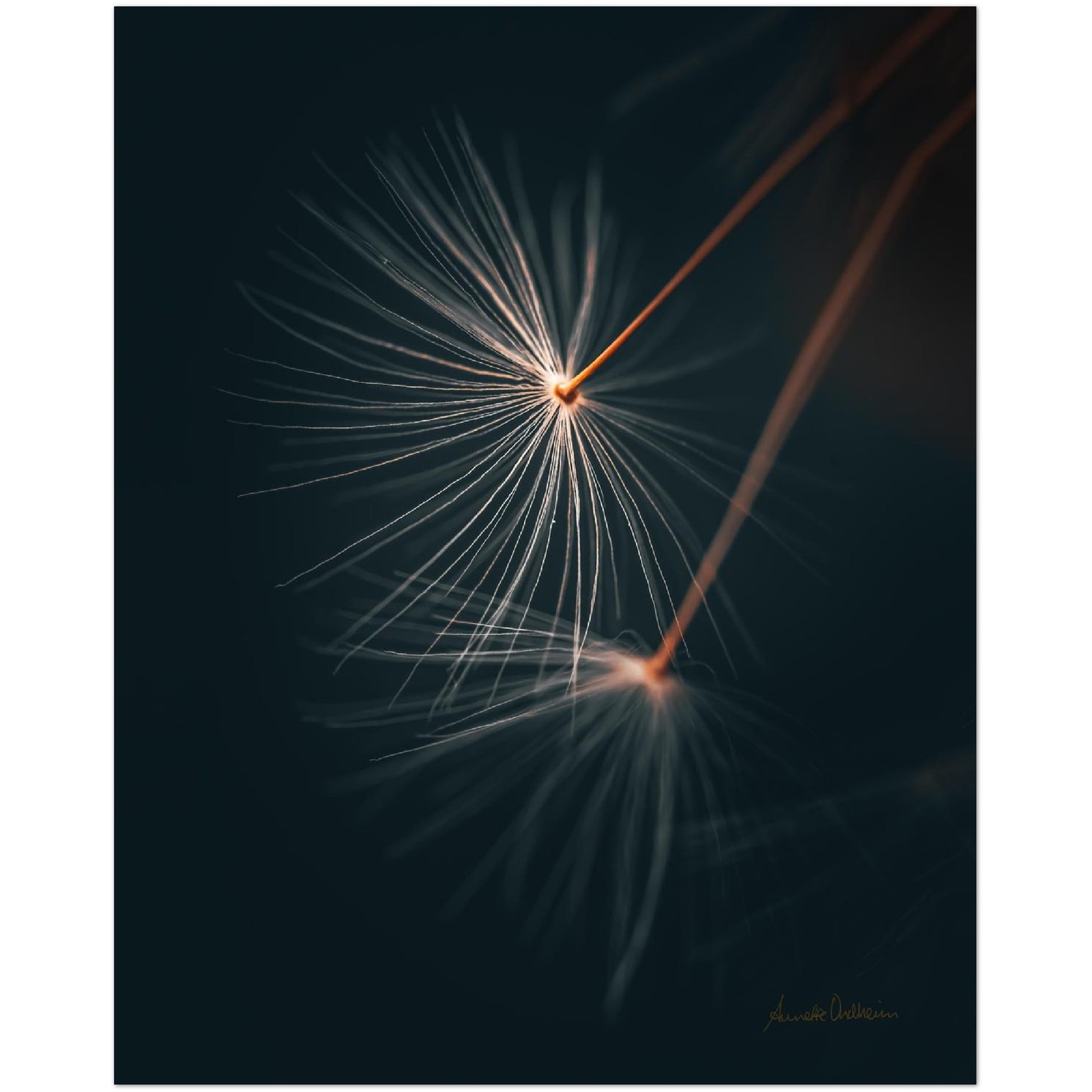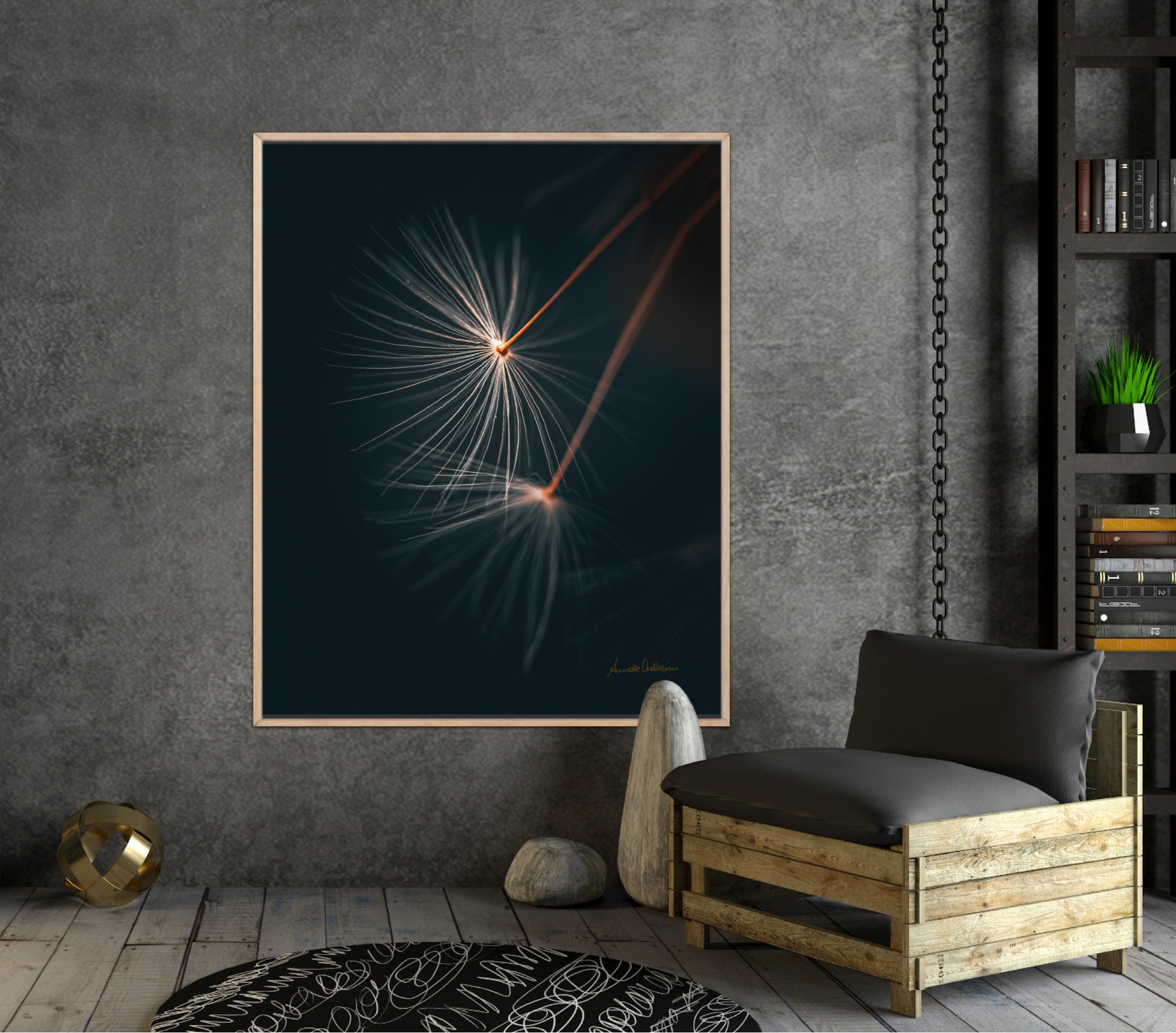 Vakker kunstplakat fra fotografi av et løvetannfrø i nydelig lys. Få et unikt kunstverk på veggen med dette bildet. La deg fascinere og inspirere av naturen og finn roen i ditt hjem med dette fine veggbildet.