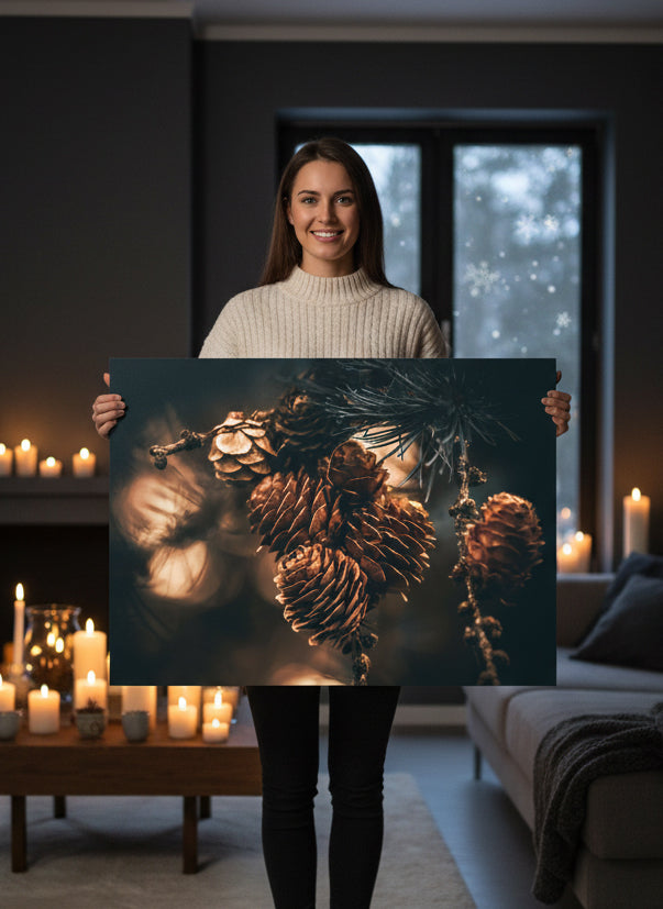 Nydelig kunstbilde av flere lerkekongler på gren, med nydelig gyldent lys i bakgrunnen. Dette bildet blir flott på veggen din!